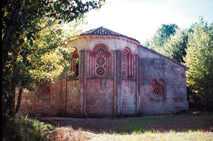 Volvemos a la explanada donde hemos dejado el coche, junto al primer refugio, y opto por dejar el curso del Pelagallinas, que pronto se perderá por escarpados barrancos en dirección a Prádena de Atienza para luego confluir con el Bornova en un lugar denominado Las Juntas de los Ríos. Quiero acercarme hasta Albendiego, después de pasar por Condemios de Abajo, pueblo aquél regado por un Bornova recién nacido y que no tiene un aspecto más caudaloso que el del Pelagallinas. Como muchos saben, una turbia historia de templarios, caballeros de la Orden de Malta y monjes agustinos, legaron a Albendiego una de las mejores iglesias románicas de la provincia. Tiene por nombre Santa Coloma y se halla junto al río Bornova, a un kilómetro del pueblo, rodeada de árboles y en medio de un prado. La sencilla espadaña y el atrio de la puerta principal no avisa del inmenso tesoro que se descubre en el ábside posterior, formado por tres ventanales abocinados, con caladas celosías de aires mudéjares y orientales.