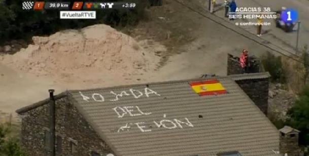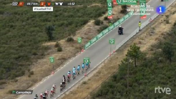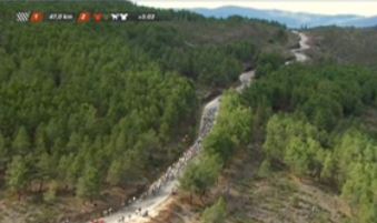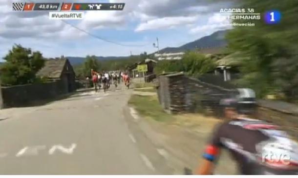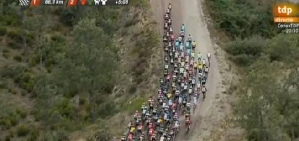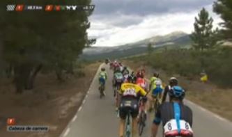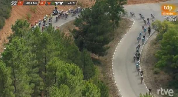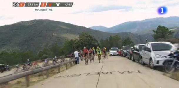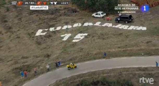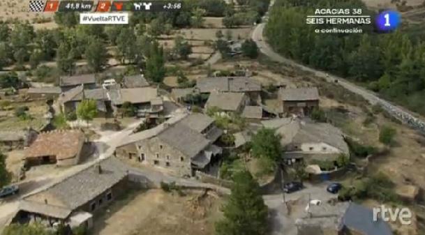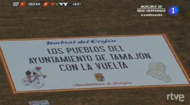 Los corredores a su paso por CampillejoPrecisamente estos últimos 80 kilómetros fueron los transcurridos entre la llegada de los ciclistas a la provincia de Guadalajara desde la vecina Ayllón, por la carretera de Cantalojas. De ahí siguieron hasta Galve de Sorbe, donde había dos pancartas denunciando la situación de su castillo, subieron el puerto del Campanario (el “collao” para los lugareños) y tras una espectacular bajada se metieron por la carretera de Umbralejo, pasaron por Valverde, que salió bien en televisión, y bordearon el Ocejón por Palancares hasta Tamajón. En ambos pueblos no quisieron desaprovechar la oportunidad y prepararon dos mosaicos saludando a la Vuelta para las tomas del helicóptero, que constituyen una fina publicidad gratuita. Por entonces, el televidente ya estaba maravillado por este desconocido paisaje que aparecía en su televisión, y que Carlos de Andrés se refería a él como una típica etapa de Tour de Francia en el macizo central.