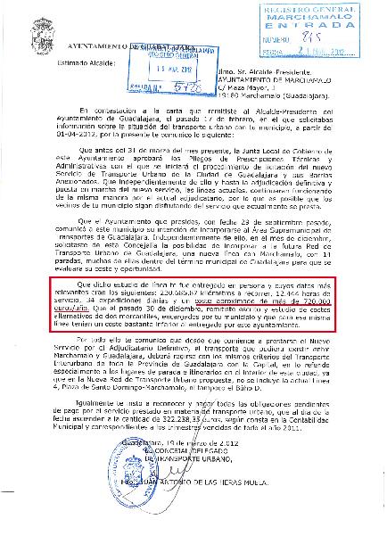 Según una carta del entonces concejal de Transportes de Guadalajara, Juan Antonio de las Heras, que hoy ha hecho pública el Ayuntamiento de Marchamalo, esa nueva línea habría recorrido 230.686 kilómetros (la pactada ahora con la Junta sería de 164.474 km), con 12.444 horas de servicio, y hubiera tenido 34 expediciones diarias frente a la nueva línea que tendría 27 expediciones de ida y vuelta en días laborables, 16 los sábados, dos búhos nocturos para la noche del domingo y 9 expediciones de ida y vuelta también el domingo. El coste estimado del servicio que rechazó Marchamalo fue de 720.000 euros al año, según contestó De las Heras a Rafael Esteban el 19 de marzo de 2012, aunque el alcalde citó ayer la cifra de unos 360.000 euros anuales.