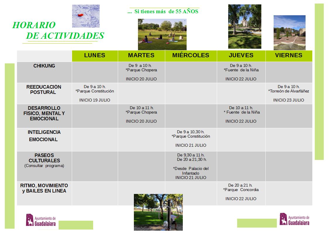 En cuanto al resto de actividades, los lunes, de 09:00 a 10:00 horas habrá Reeducación postural en el parque de la Constitución; los martes, también de 09:00 a 10:00, en el parque de La Chopera, Chikung, y de 10:00 a 11:00, la actividad Desarrollo físico, mental y emocional.