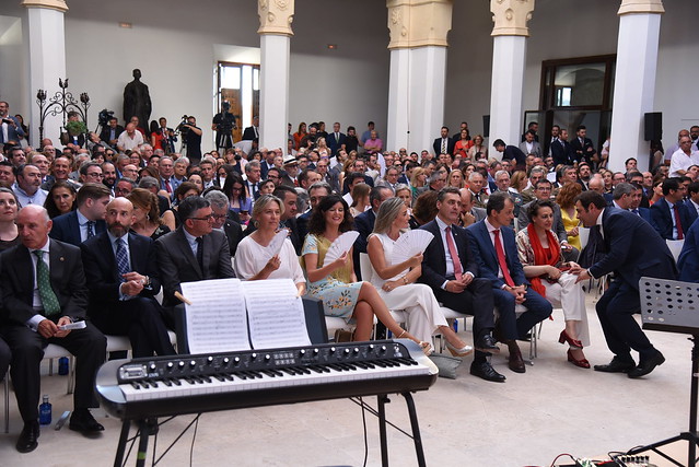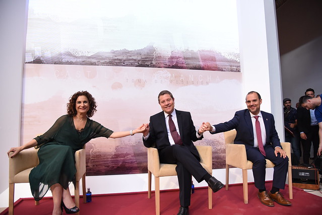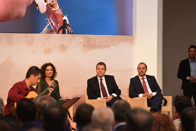 No estuvo el presidente del Gobierno Pedro Sánchez, como hace cuatro años en la primera toma de posesión de Page, aunque le agradeció que enviara a tres ministros: la ministra de Hacienda en funciones, María Jesús Montero, que ocupó un lugar preferente, y sus compañeros de gabinete la titular de Trabajo y Seguridad Social en funciones, Magdalena Valerio y el ministro de Ciencia, Innovación y Universidades en funciones, Pedro Duque. También estuvieron los expresidentes autonómicos socialistas José Bono Martínez y José María Barreda Fontes. No acudió María Dolores Cospedal, ni los dos miembros del gobierno en funciones en representación de Podemos, que muy probablemente dejará de estarlo mañana mismo con el nombramiento del segundo Ejecutivo de Page, monocolor, y con apenas cambios sobre el actual.