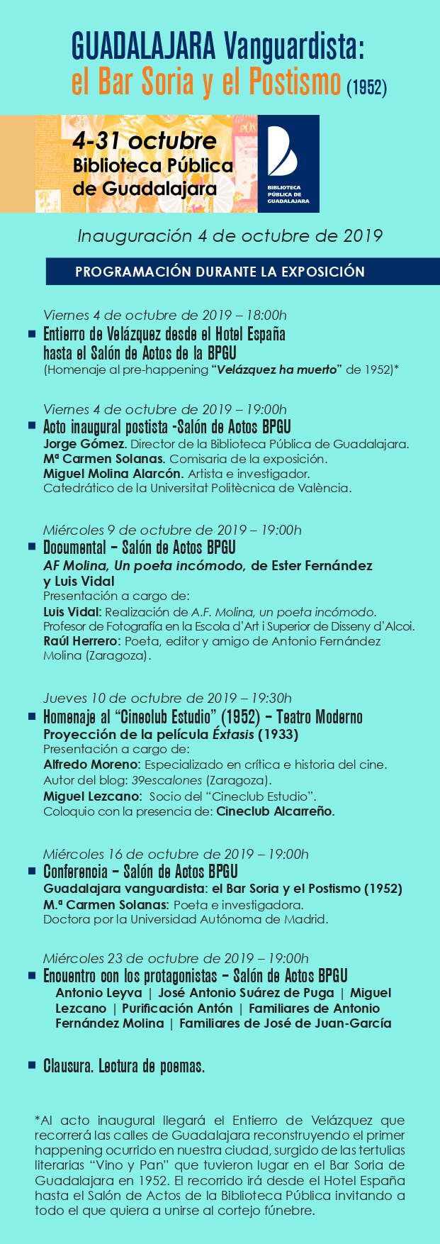 La Biblioteca pública provincial, va a acoger a lo largo de todo el mes de octubre el ciclo “Guadalajara vanguardista: el Bar Soria y el Postismo”, con el que se pretende recuperar y divulgar una época de gran transcendencia cultural en la vida de la ciudad, que se fecha en la mitad del siglo XX y cuyo centro de actividad se ubicaba en las tertulias literarias “Vino y Pan” que se celebraban en el bar Soria, mítico local de la ciudad hoy ya desaparecido.