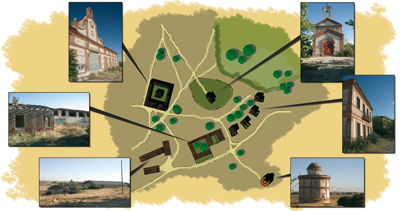 Casas del poblado en la actualidad. Foto: GD.La capilla del poblado se dedica a San Diego, el patrón del lugar. Estaba divida en tres salas: un acceso, la capilla propiamente dicha cubierta con bóveda de medio cañón con lunetos, y la sacristía. Es el único edificio del complejo cubierto con teja cerámica plana. Precisamos que "estaba", porque es el edificio que ha sido más vandalizado, hasta el punto de que esas descripciones arquitectónicas son casi irreconocibles.