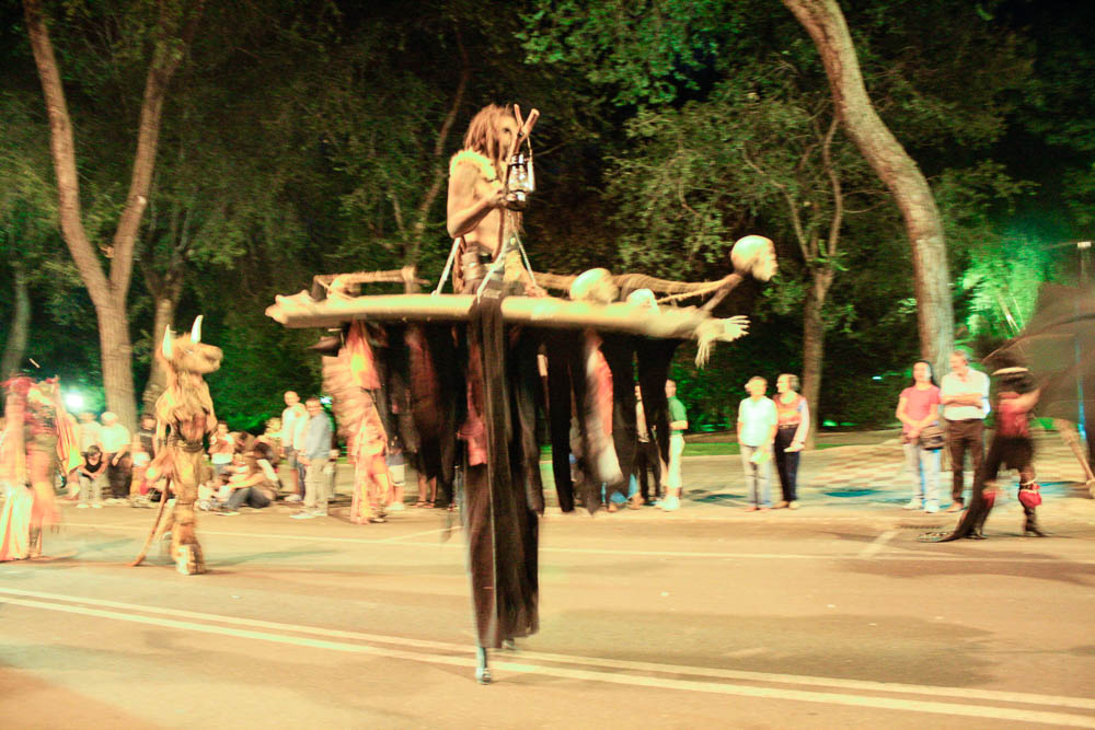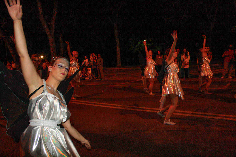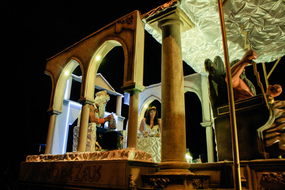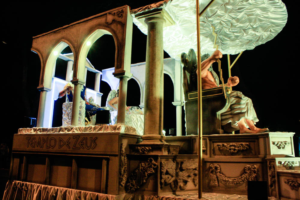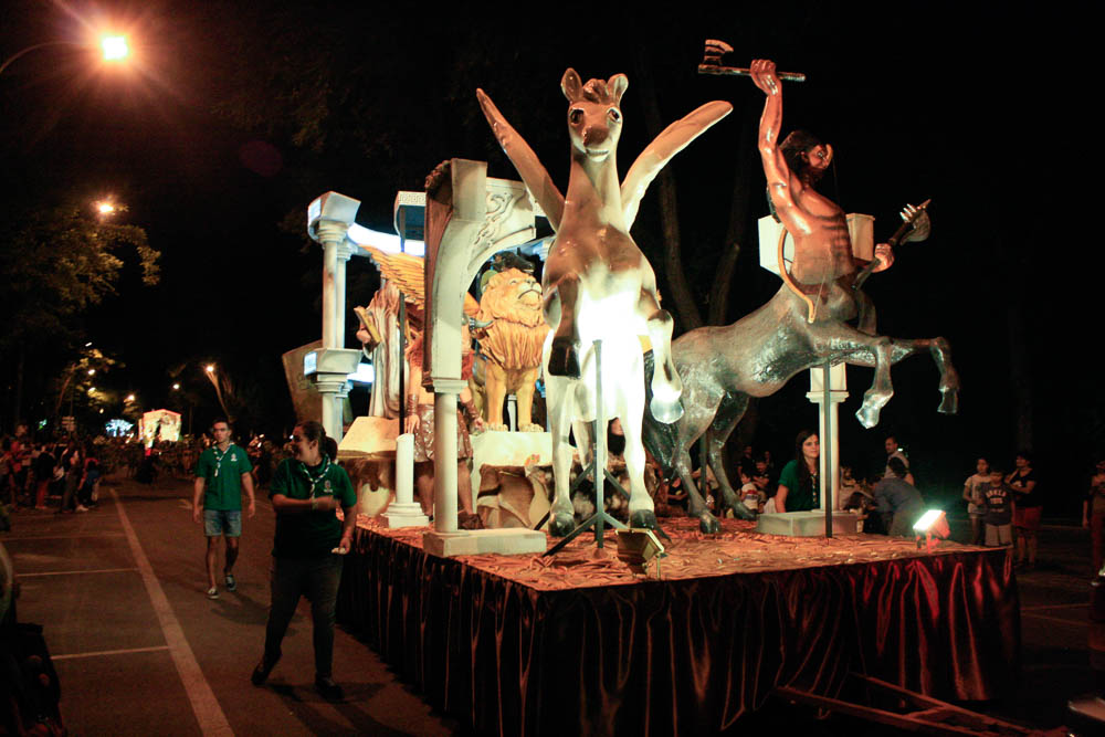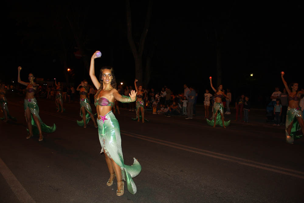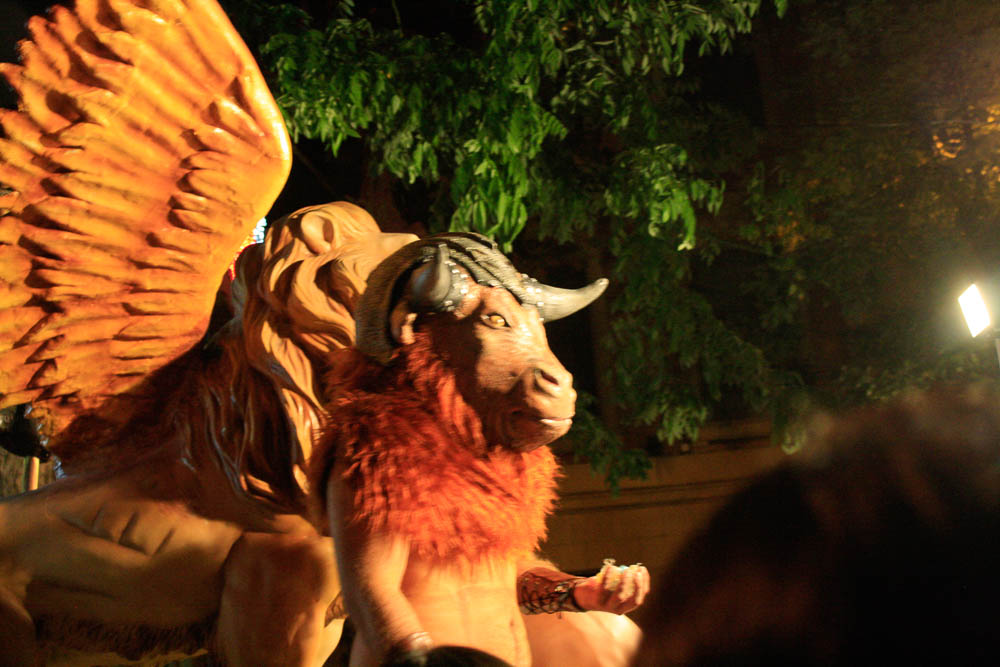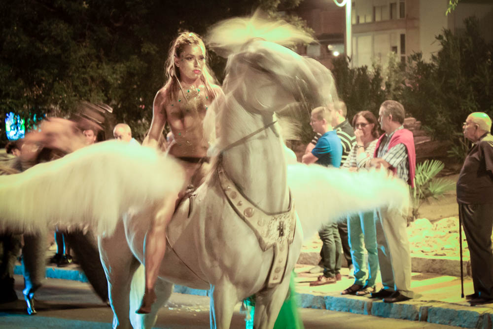 Abrió el desfile una estatuas ballet, muy bien caracterizadas. Luego dos carrozas dedicadas a los dioses de la antigua Grecia y Roma, Zeus y Júpiter, con su conjunto de bailarinas ataviadas al estilo helénico. Los dioses del mar Neptuno y Poseidón protagonizaron el segundo grupo escénico, con unas maravillosas sirenas e inquietantes seres marinos. Pegasos, un conjunto de minotauros y una bella mujer centauro sobre un imponente caballo blanco constituían el cuadro de criaturas míticas. La cuarta escena de esta cabalgata mitológica estaba dedicada a los dioses de la guerra, Ares y Marte, y allí aparecieron oscuros seres que parecían salidos del mismísimo infierno, lanzando fuego por doquier. Un cambio radical nos trajo el quinto cuadro dedicado a las diosas del amor y la belleza, Afrodita y Venus, con una delicada escolta de hadas. En cualquier mitología que se precie no pueden faltar las celebraciones bacanales, que tanta fama alcanzaron en la vieja Grecia y Roma por sus eternas fiestas. Y allí aparecieron sus dioses más caraterizados: Baco y Dionisos a los que seguían un grupo de duendes y seres fantásticos. El último cuadro se alejó del Mediteráneo y estaba dedicado a las mitoloigías inca y egipcia, cerrando el cortejo un grupo de escorpiones que amenanzaban con clavar su aguijón a los espectadores y se arrastrasban por el suelo.![]()