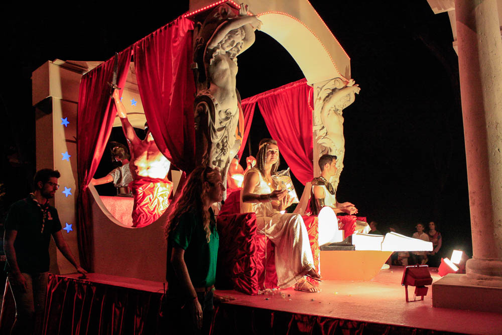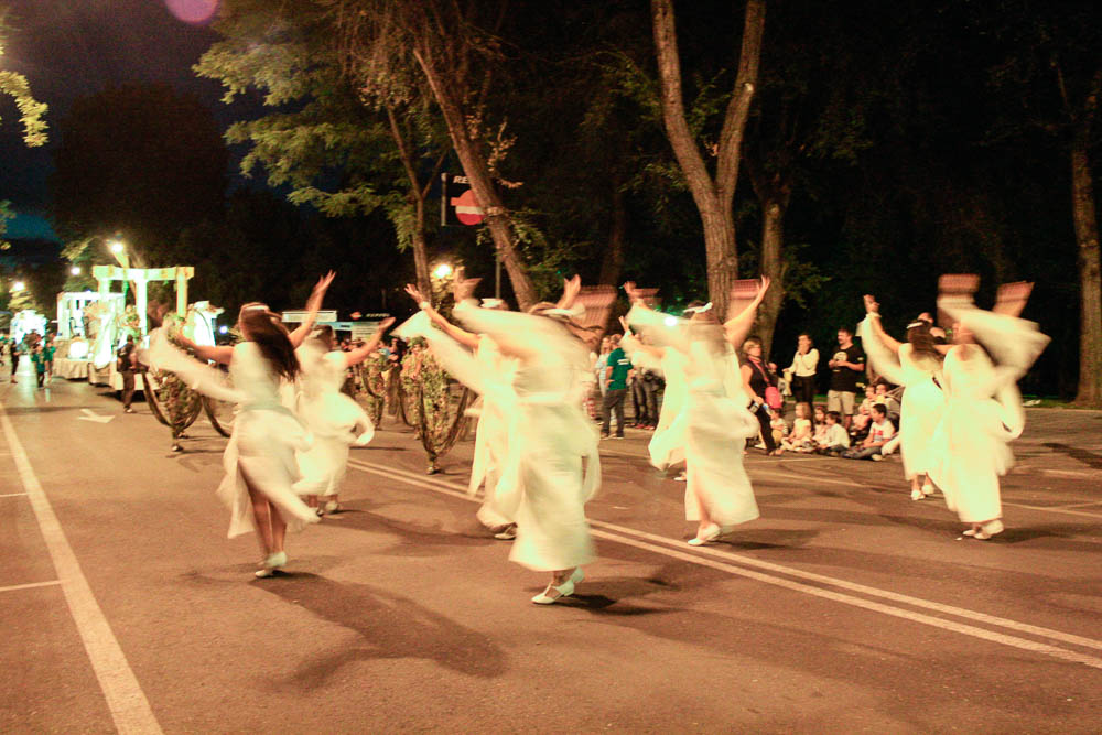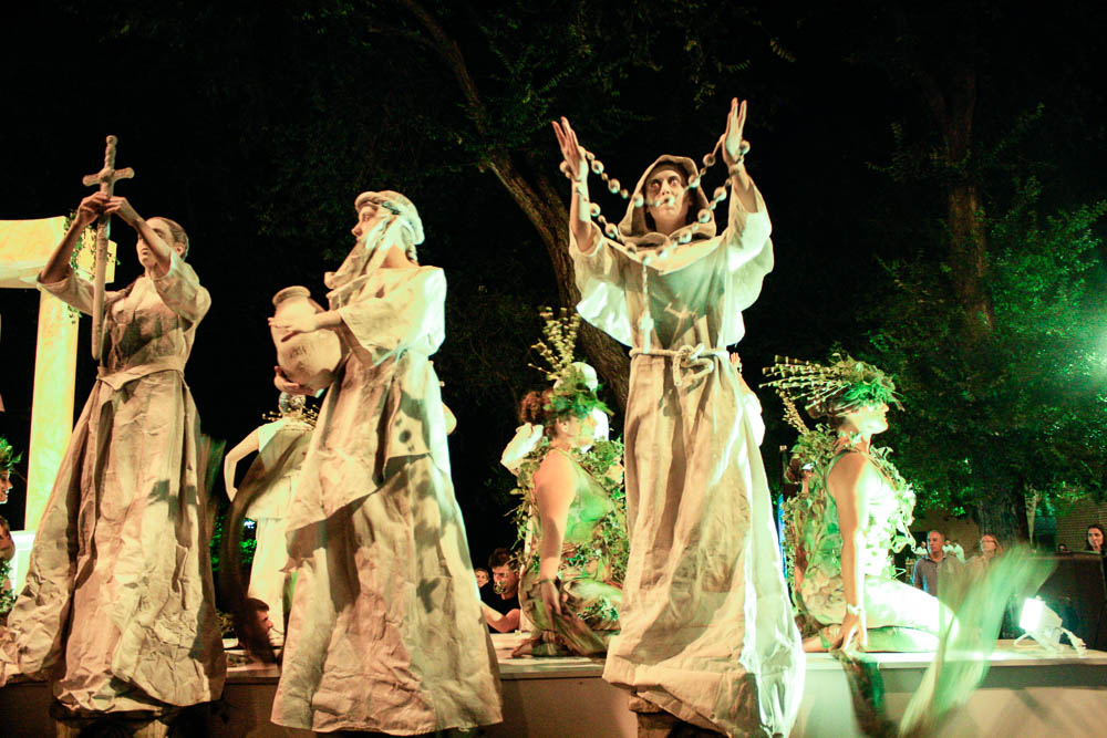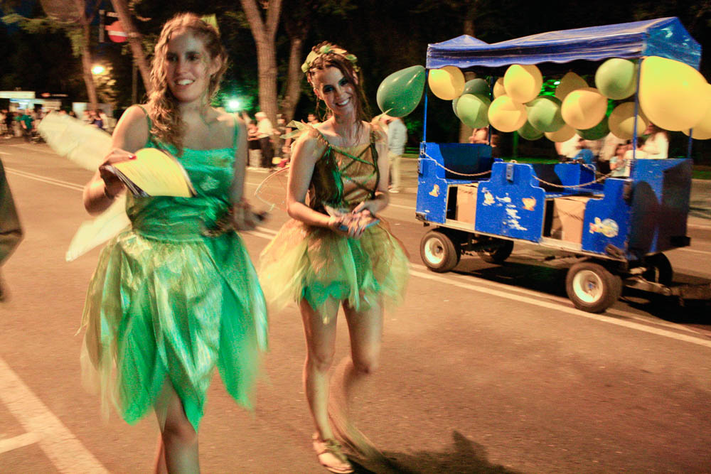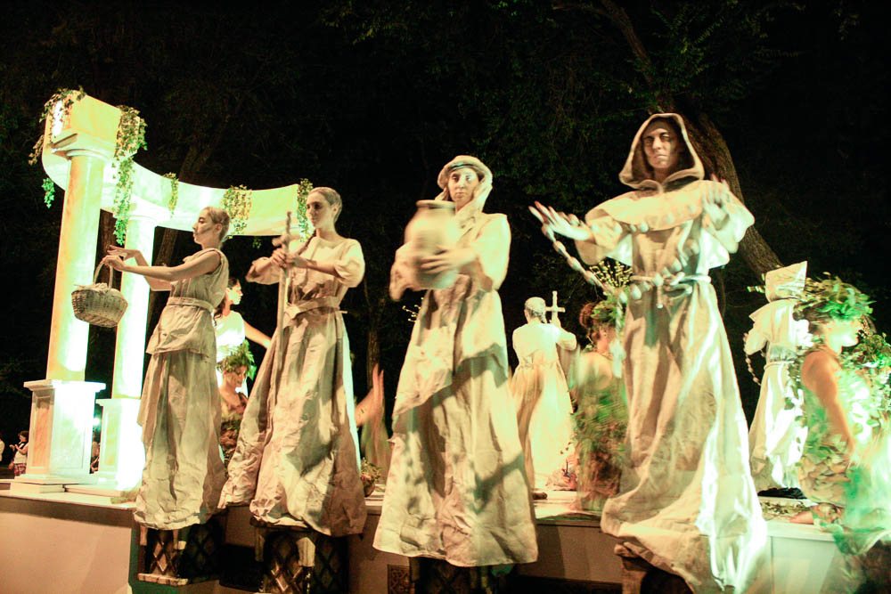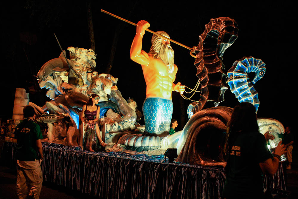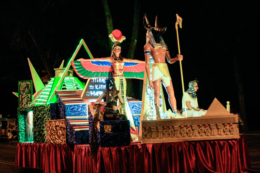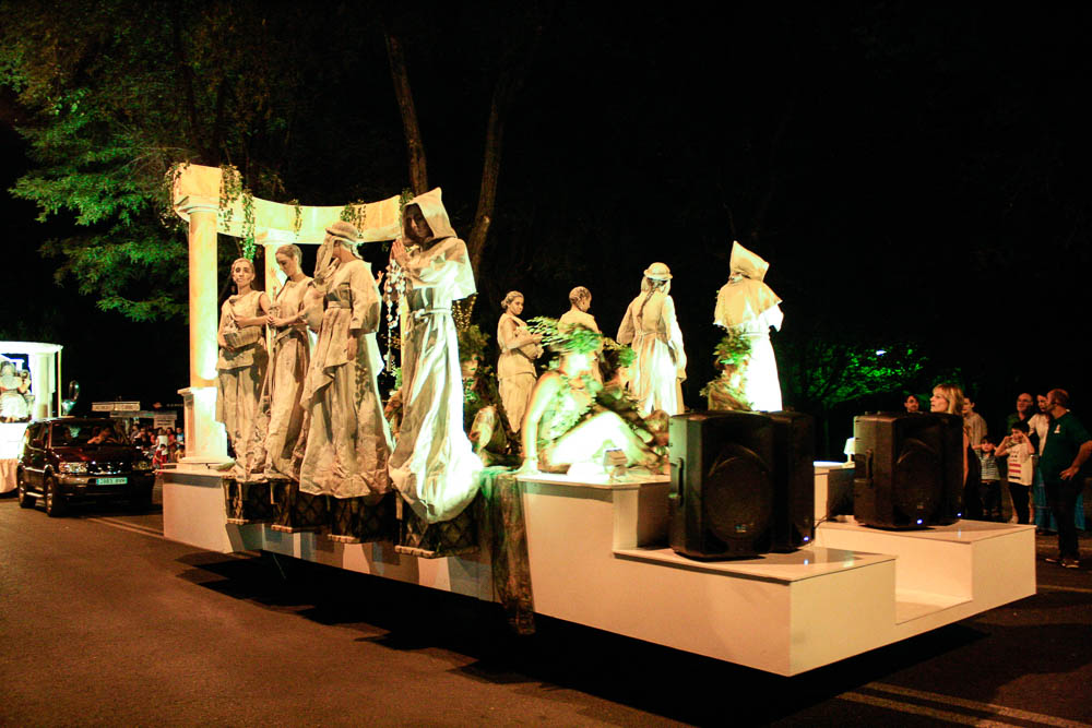Abrió el desfile una estatuas ballet, muy bien caracterizadas. Luego dos carrozas dedicadas a los dioses de la antigua Grecia y Roma, Zeus y Júpiter, con su conjunto de bailarinas ataviadas al estilo helénico. Los dioses del mar Neptuno y Poseidón protagonizaron el segundo grupo escénico, con unas maravillosas sirenas e inquietantes seres marinos. Pegasos, un conjunto de minotauros y una bella mujer centauro sobre un imponente caballo blanco constituían el cuadro de criaturas míticas. La cuarta escena de esta cabalgata mitológica estaba dedicada a los dioses de la guerra, Ares y Marte, y allí aparecieron oscuros seres que parecían salidos del mismísimo infierno, lanzando fuego por doquier. Un cambio radical nos trajo el quinto cuadro dedicado a las diosas del amor y la belleza, Afrodita y Venus, con una delicada escolta de hadas. En cualquier mitología que se precie no pueden faltar las celebraciones bacanales, que tanta fama alcanzaron en la vieja Grecia y Roma por sus eternas fiestas. Y allí aparecieron sus dioses más caraterizados: Baco y Dionisos a los que seguían un grupo de duendes y seres fantásticos. El último cuadro se alejó del Mediteráneo y estaba dedicado a las mitoloigías inca y egipcia, cerrando el cortejo un grupo de escorpiones que amenanzaban con clavar su aguijón a los espectadores y se arrastrasban por el suelo.![]()