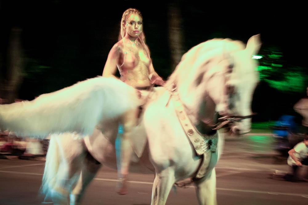 Una mujer monta un caballo alado. Fotos: GuadalajaraDiario. Más de 35.000 personas coparon el recorrido durante el desfile de carrozas en una agradable noche en Guadalajara, que este año estuvo dedicado a la "Fantasía de dioses y monstruos". GALERÍA DE IMÁGENES