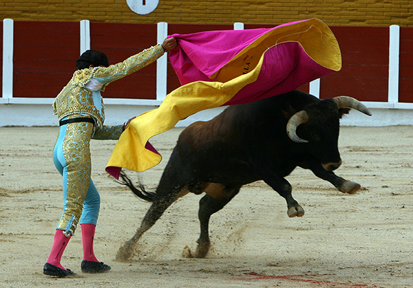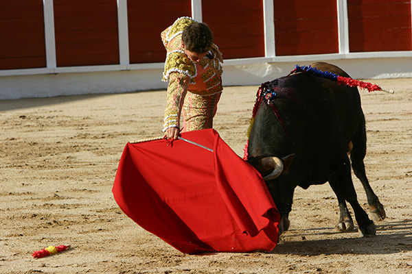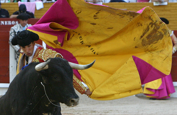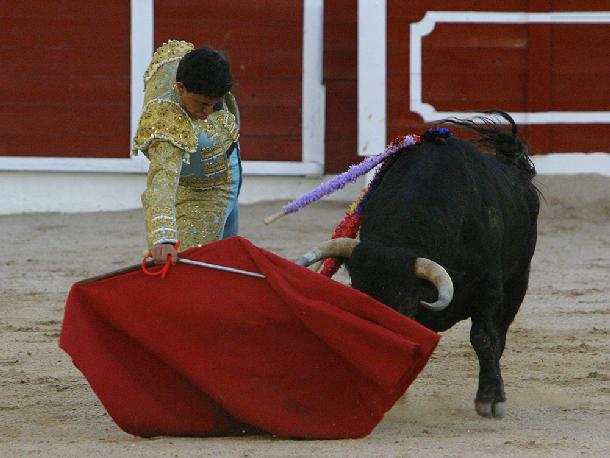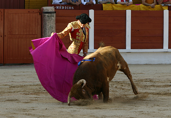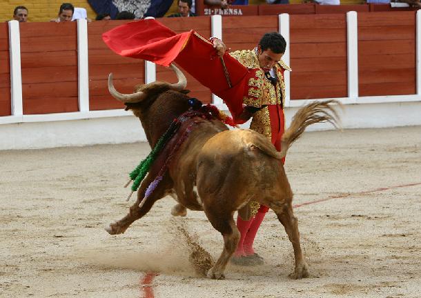 Un derechazo de Castilla. Foto: F.ToqueroA la novillada le estaba faltando vida cuando salió el tercero, que llegó al último tercio con más fuelle que sus hermanos, aunque embistió sin clase y con tendencia a soltar la cara. Juan de Castilla aprovechó su movilidad para armar faena por el pitón zurdo. Esperó el colombiano al animal y tiró de la embestida con largura en una labor que tuvo ajuste y asiento. Entendió bien al astado de Pereda, lo manejó con solvencia, aguantó derrotes y tarascadas y se apretó por bernadinas antes de asegurar el triunfo con el acero.