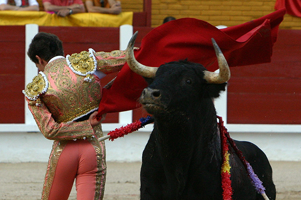 Ginés Marín remata con un pase de pecho. Foto: F. Toquero. Ginés Marín le cortó una oreja al cuarto. Animal alto y estrecho, serio por delante pese a sus avacadas hechuras, que se movió aunque estuviera exento de clase. Sus escasas virtudes las potenció el extremeño en una labor de torero puesto al que ya se le queda pequeño el escalafón menor. En medio de su solvente labor, muy por encima de la condición del animal, sobresalió el trazo y la expresión de varios naturales. Antes, con el animal que abrió feria, un castaño de finas hechuras que careció de fuerza y raza, se refugió en tablas en varas y nunca se empleó en las telas, la labor del pacense fue un trabajo estéril para intentar darle celo.
