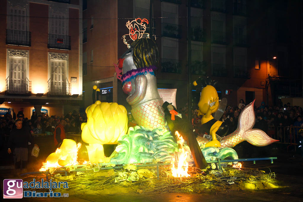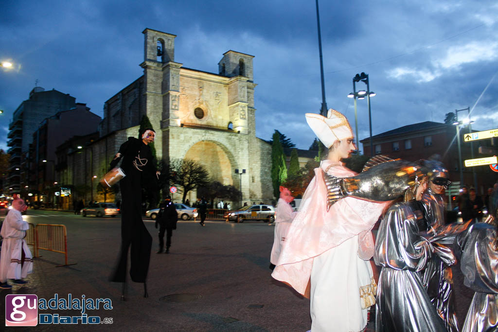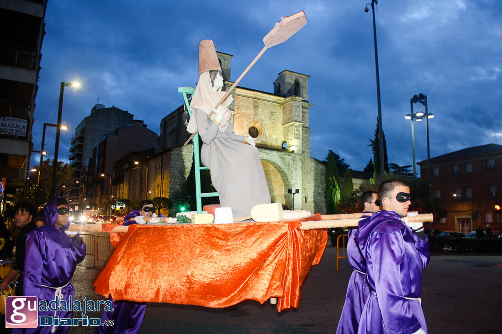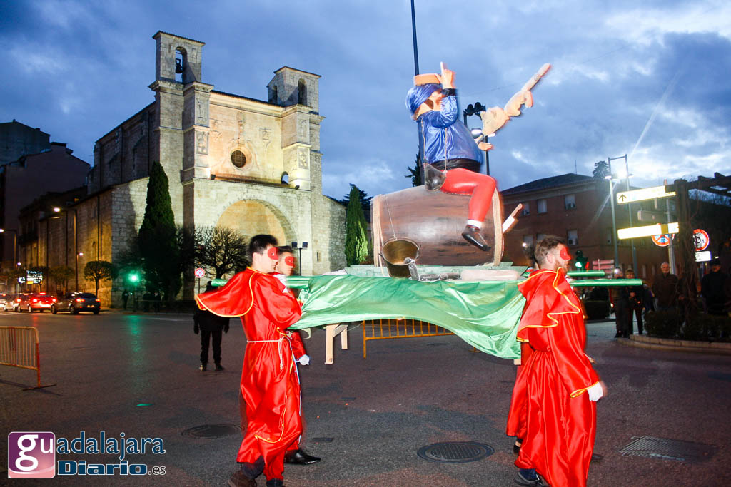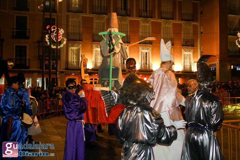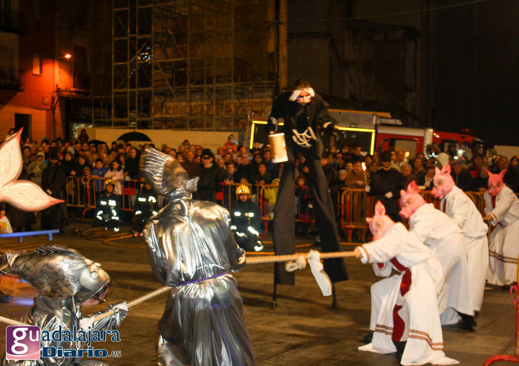La falta de impulso de la sociedad de Guadalajara, Mascarones al margen, hacen que el Entierro de la Sardina tenga que ser soportado por el Ayuntamiento, y aunque esto le haga perder espontaneidad, así son las cosas en la meseta castellana donde no se cuenta con el beneplácito del tiempo. Esta tarde-noche no hacía mucho frío, la verdad, pero la tarde era ventosa y desapacible con lo que es todavía más de agradecer la concurrencia de varios centenares de personas que se dieron cita en la plaza Mayor o a lo largo del recorrido del desfile, que se inició en el Fuerte de San Franciso.