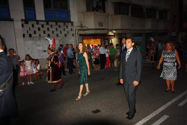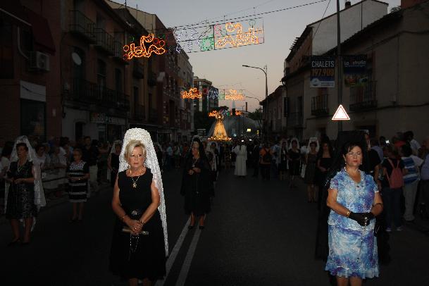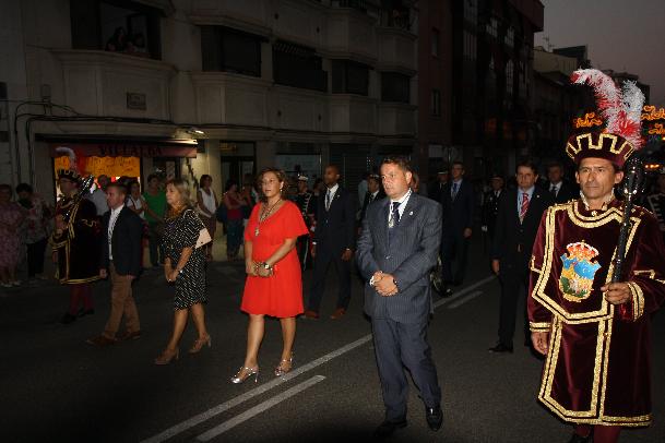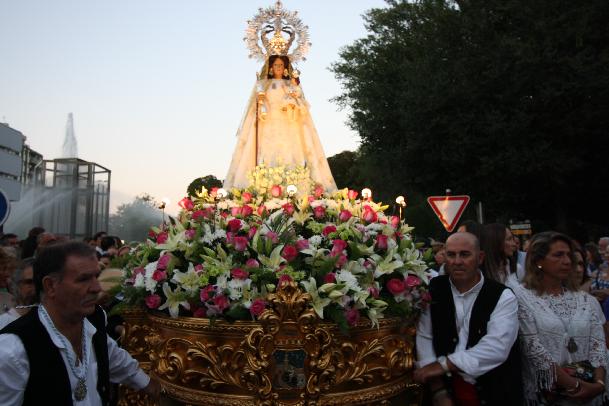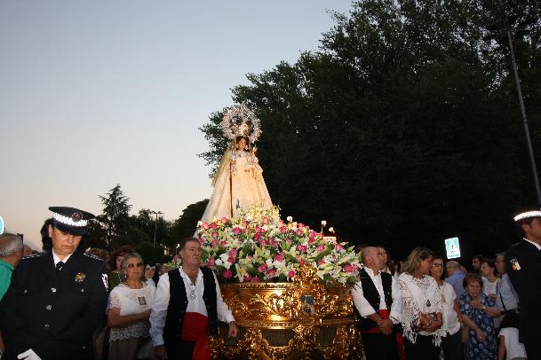 La Virgen de la Antigua, totalmente de blanco, iniciando su recorrido. Fotos: Guadalajara Diario. Varios miles de personas acompañaron a la imagen de la Virgen de la Antigua, Patrona de Guadalajara y Alcaldesa perpétua, desde la iglesia de San Francisco hasta su santuario en medio del calor y la devoción que los vecinos de Guadalajara muestran por ella. La imagen lucía un elegante manto de color blanco inmaculado. Noche agradable, después de un día caluroso, y decenas de miles de personas en las calles de Guadalajara. Amplia representación oficial. GALERIA DE IMÁGENES EN EL INTERIOR