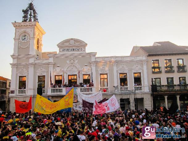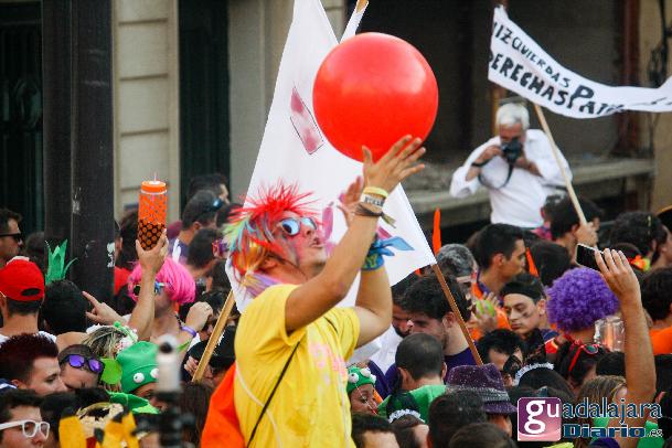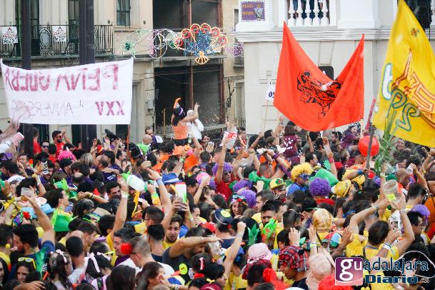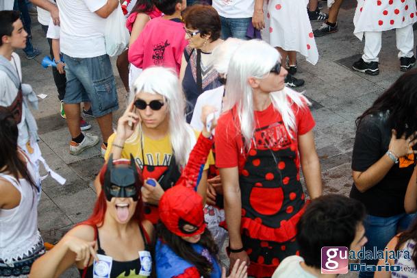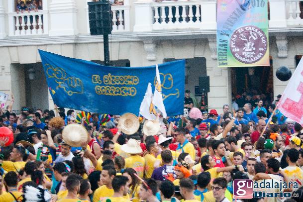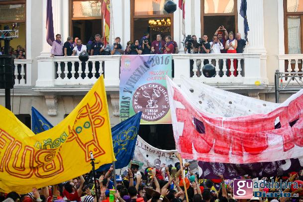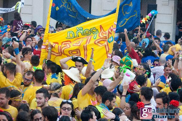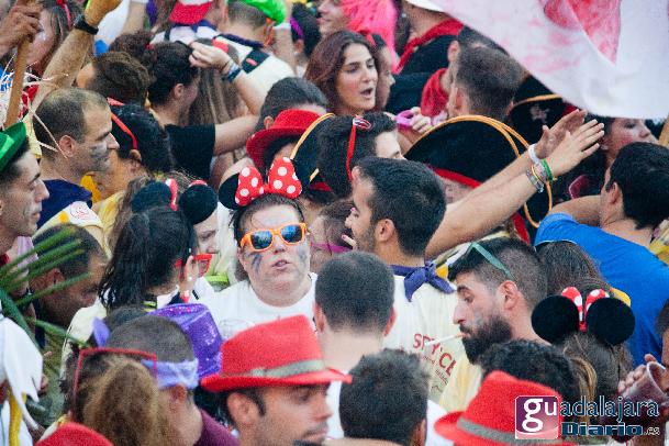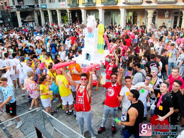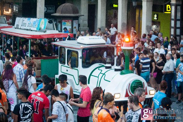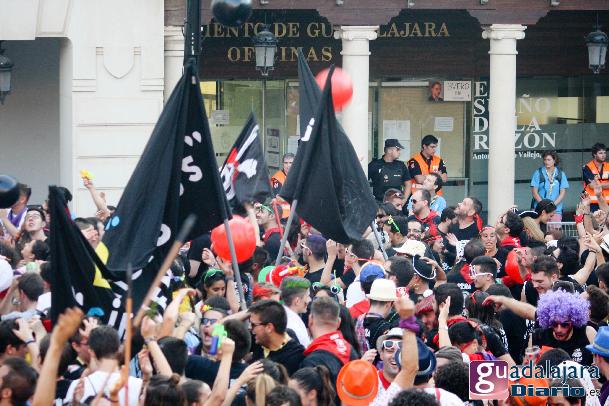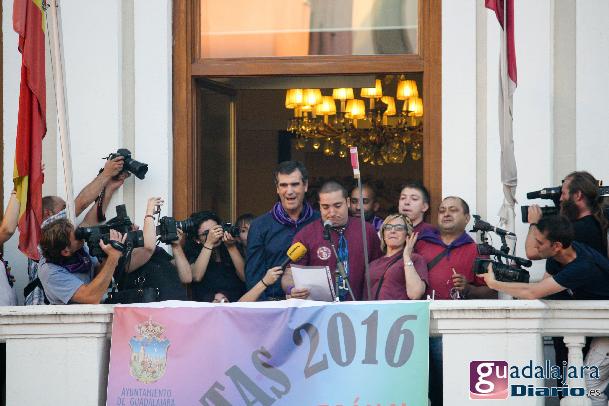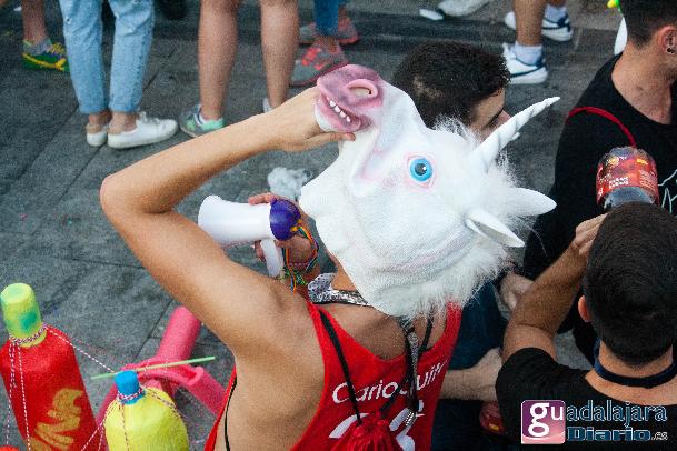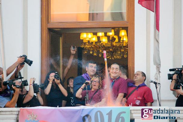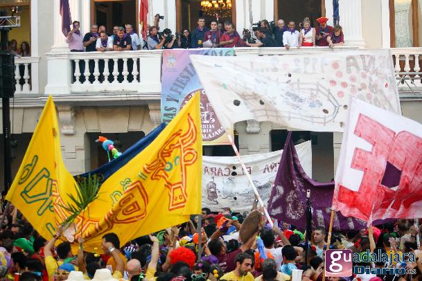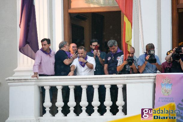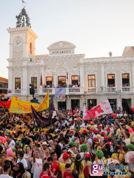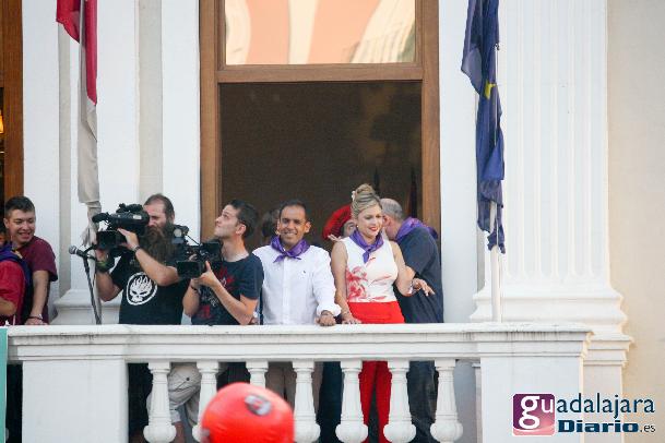 Desde media hora antes de las ocho de la tarde, la plaza Mayor se empezó a llenar de gente, en su inmensa mayoría peñistas, que empezaron a bailar al ritmo del reggaeton que sonaba por los altavoces. A las ocho en punto, los peñistas del Carajillo, una de las peñas más veteranas de Guadalajara, cumplieron con el ritual, y nos dieron un pregón breve, pidiendo a la multitud que se divirtiera lo más posible pero con responsabilidad; y terminaron con lo gritos de rigor: ¡Vivan las peñas!, ¡viva Guadalajara! y ¡viva la virgen de la Antigua!