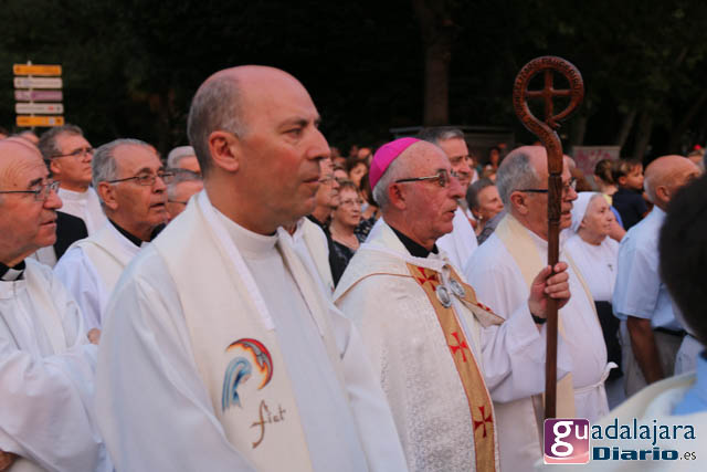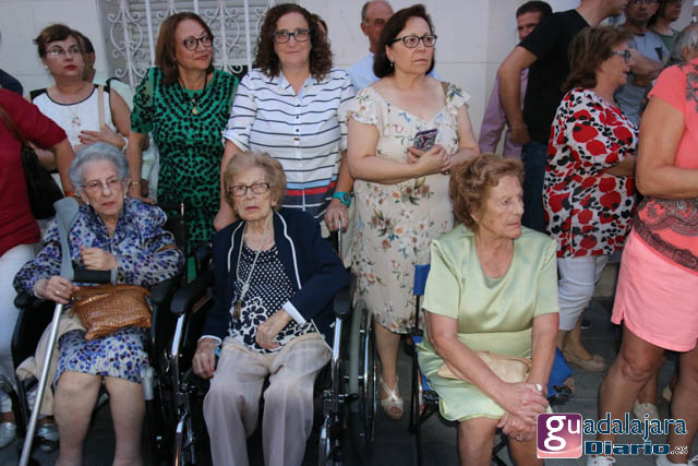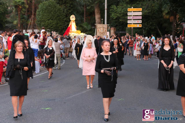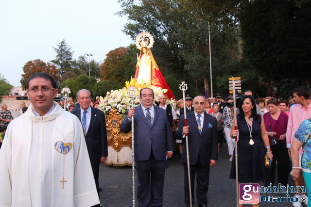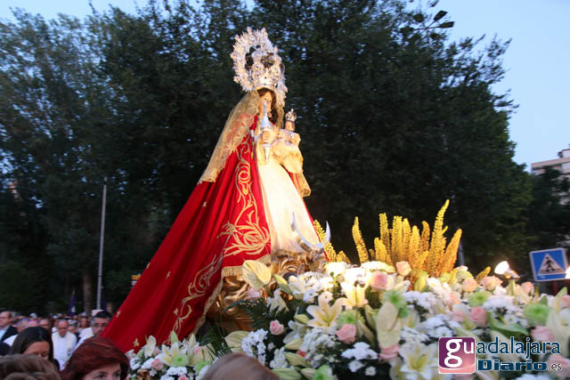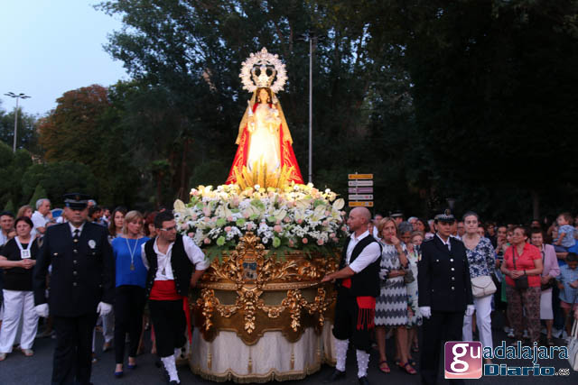 Un manto rojo bordado en oro fue el elegido para la procesión de este año./Guadalajara Diario. Varios miles de personas acompañaron a la imagen de la Virgen de la Antigua, Patrona de Guadalajara y Alcaldesa perpétua, desde la iglesia de San Francisco en el Fuerte hasta su santuario en medio del calor y la devoción que los vecinos de Guadalajara muestran siempre por ella. GALERIA DE IMÁGENES EN EL INTERIOR