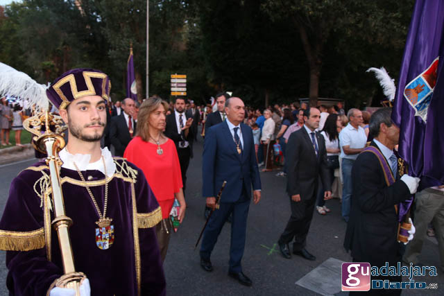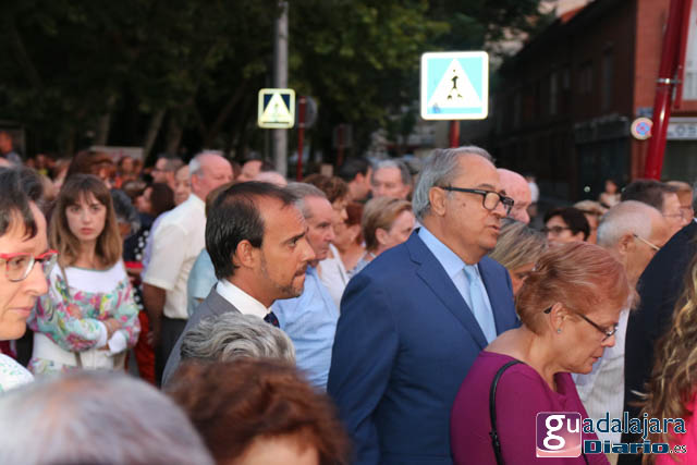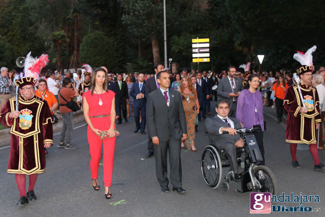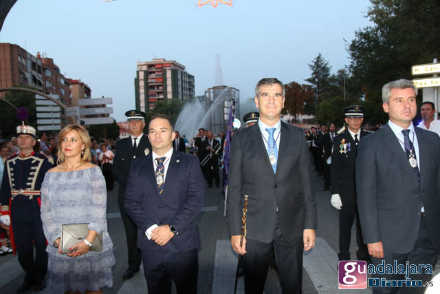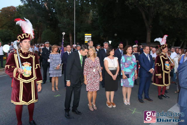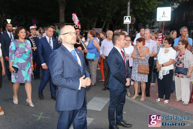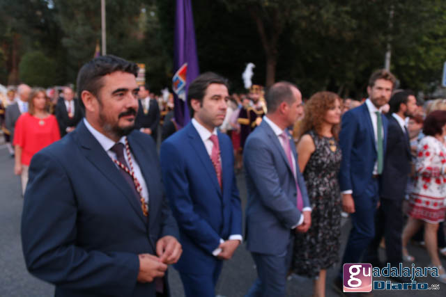 Un manto rojo bordado en oro fue el elegido para la procesión de este año./Guadalajara Diario. Castilla-La Mancha, José Julián de Gregorio, la viceconsejera de Hacienda,la alcarreña Pilar Cuevas, el delegado de la Junta, Alberto Rojo, y otros altos cargos civiles y militares. En corporación, con estandartes y maceros, desfilo una amplia representación de la Diputación, con su presidente José Manuel Latre a la cabeza y la vicepresienta Ana Guarinos. También muy concurrida fue la representación del Grupo Socialista, que encabezó Daniel Jiménez, por Ciudadanos estuvieron sus dos concejales Alejandro Ruiz y Ángel Bachiller, y luego todos los concejales del equipo de Gobierno encabezados por el alcalde Antonio Román, vicealcalde y tenientes de alcalde. Como es habitual, el grupo de Ahora Guadalajara no envió representación.