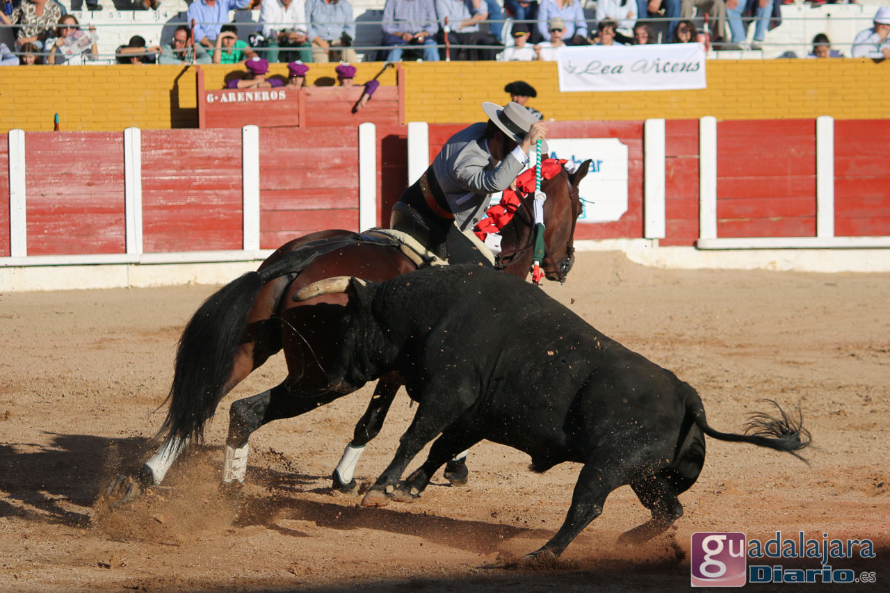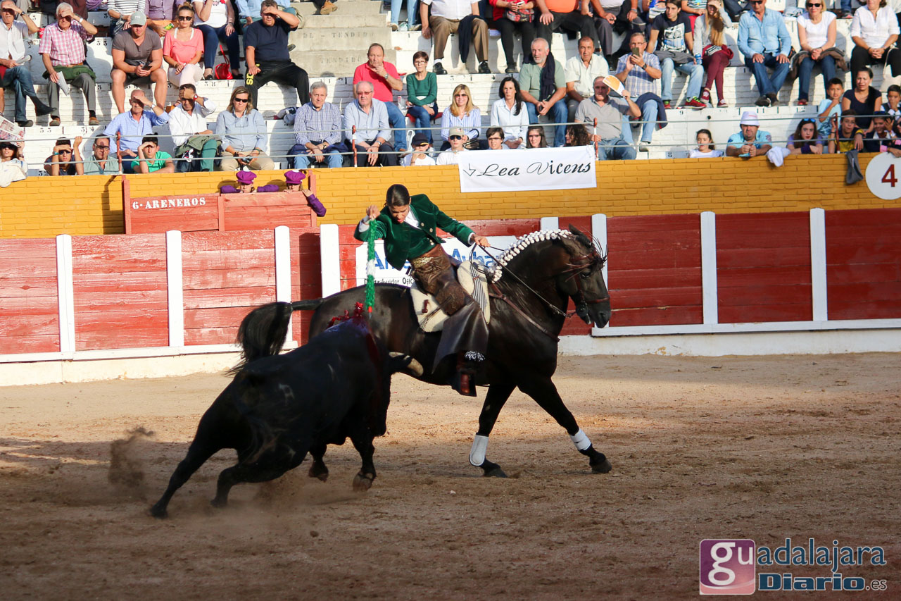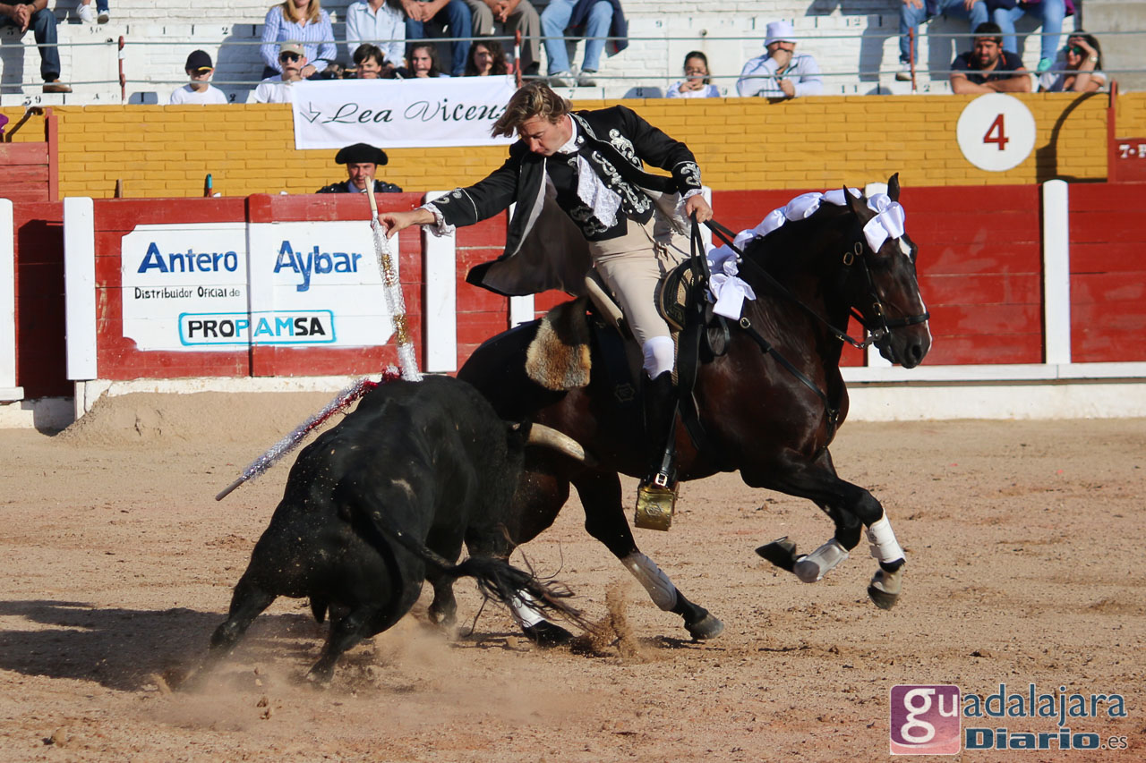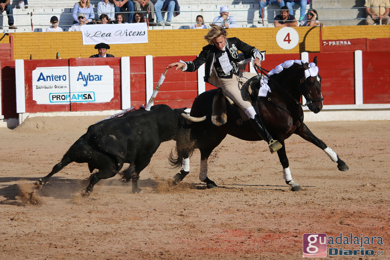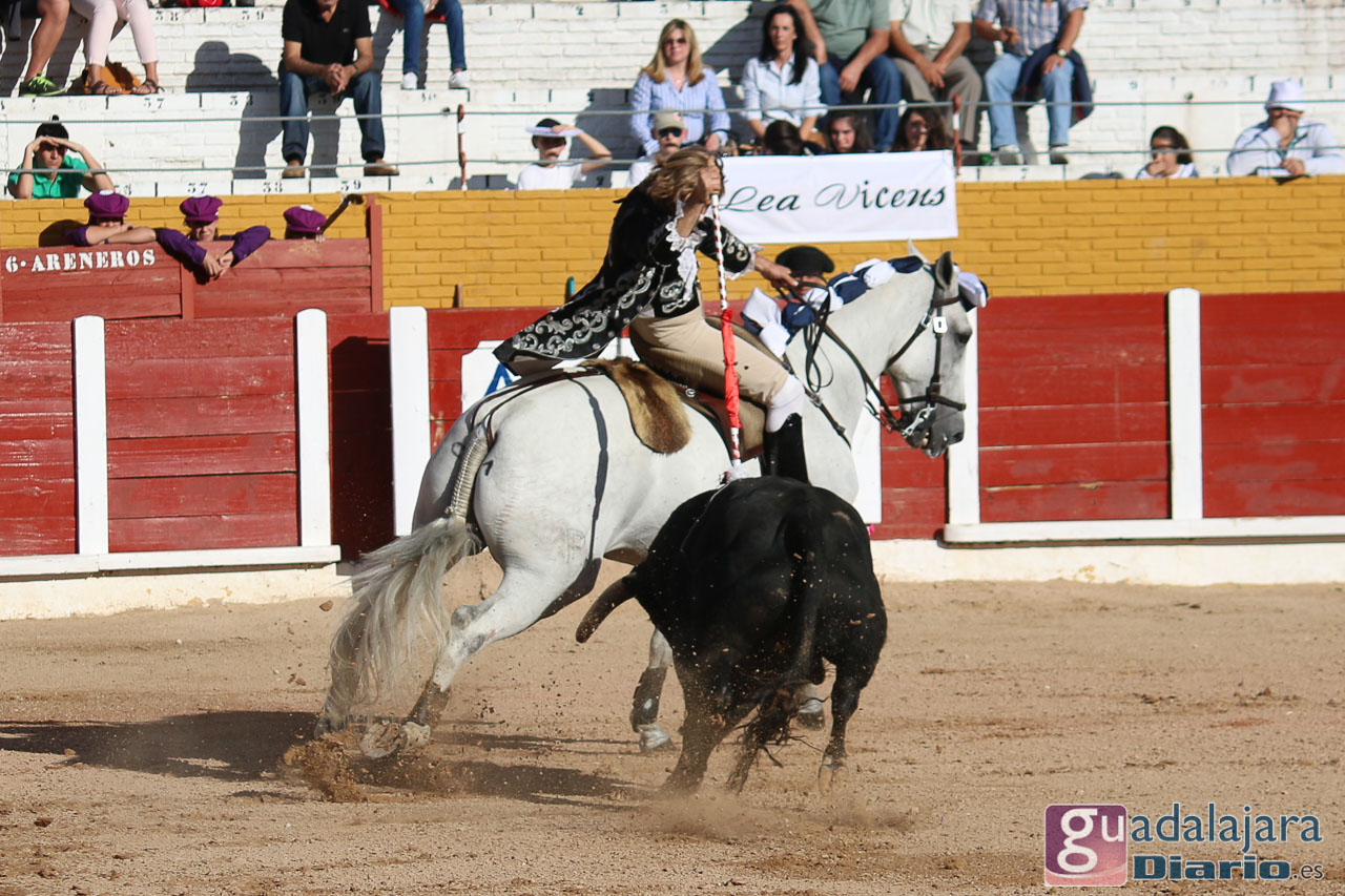 Lea Vicens, muy exigida, intentando colocar un rejón de muerte. No tuvo su tarde. Lea Vicens no tuvo su tarde. Estuvo desconfiada y castigó mucho a sus toros con dos rejones cada uno. Ejecutó poco reunido y nunca tuvo compromiso en sus actuaciones. Todo se terminó de estropear a la hora del rejón definitivo, donde falló reiteradamsnte y dió un sainete con el descabello.