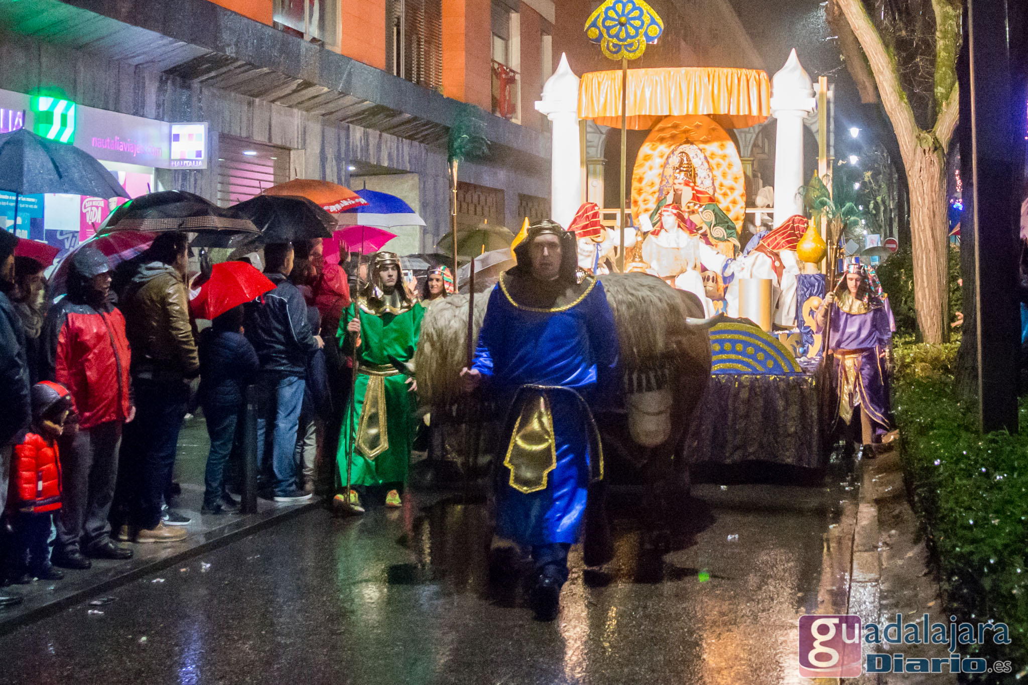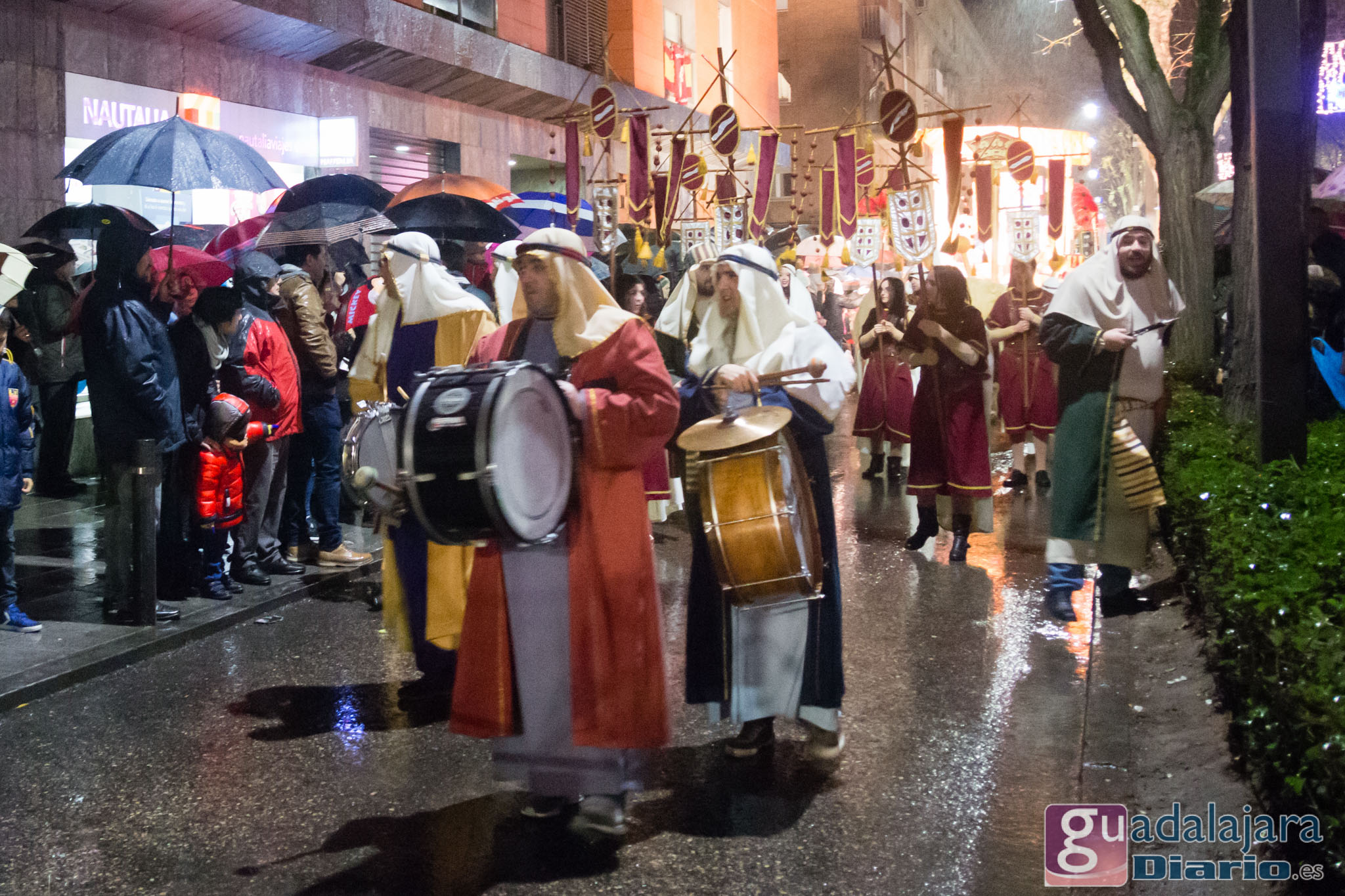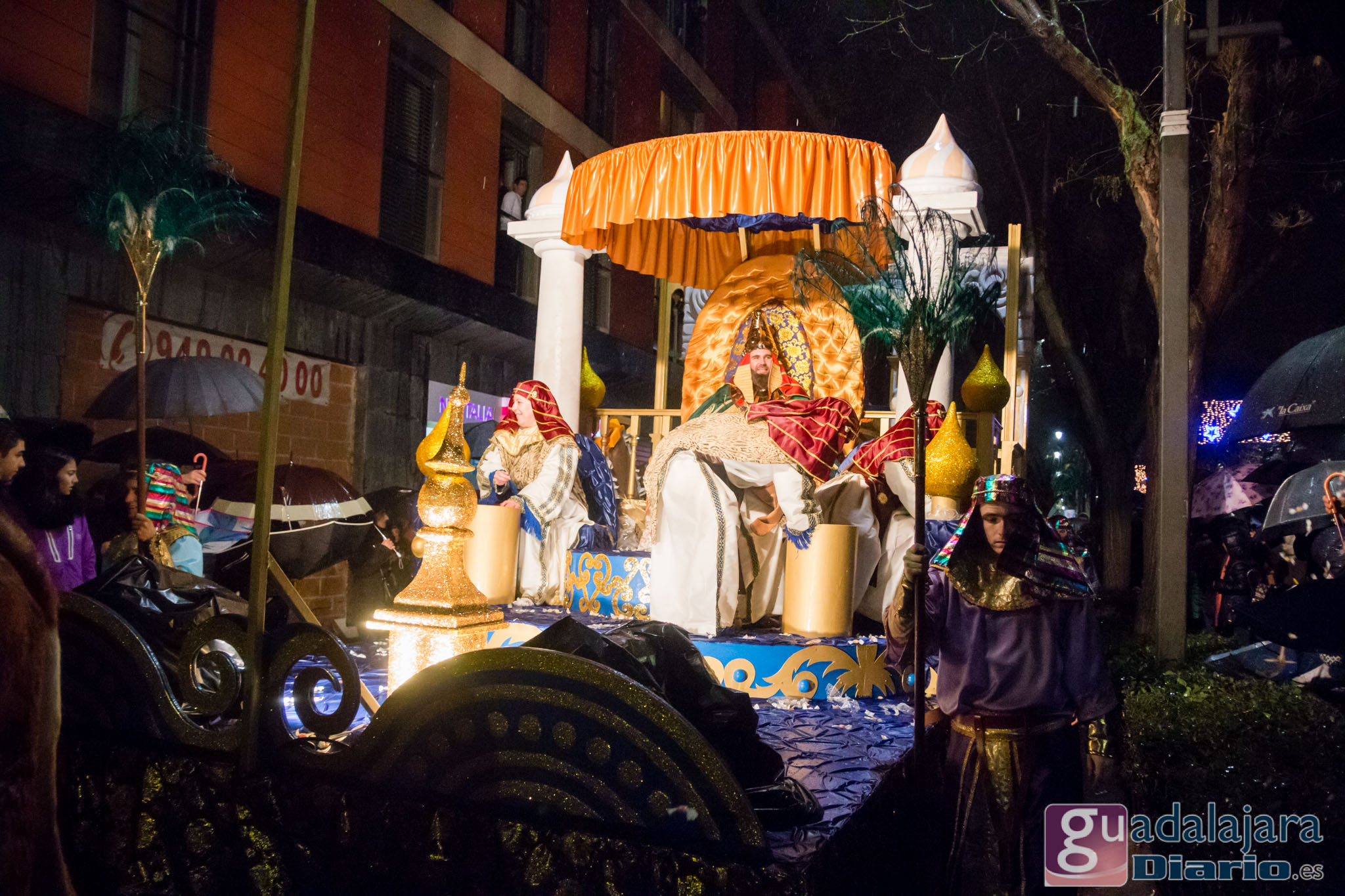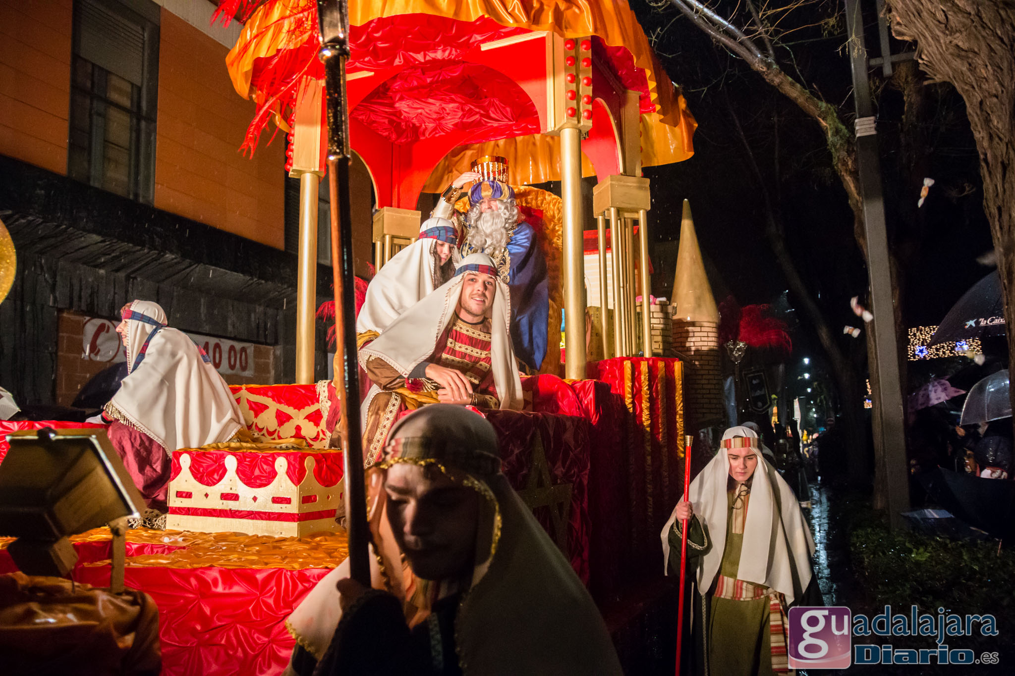 Estamos en sequía severa en las Mancomunidad de Aguas del Sorbe; hemos dejado atrás el mes de diciembre más seco en los últimos 77 años;la cabecera del Tajo está solo al 9,4% para terminar del año; y en las iglesias los sacerdotes hacen ruegos para que llueva. Así que los Reyes Magos hicieron uso de sus poderes y no les importó llegar a Guadalajara bajo un manto de agua: leve al principio de comenzar la Cabalgata y más intensa cuando llevabamos una hora de desfile.