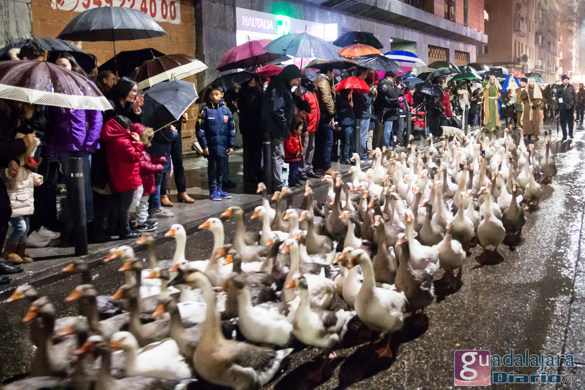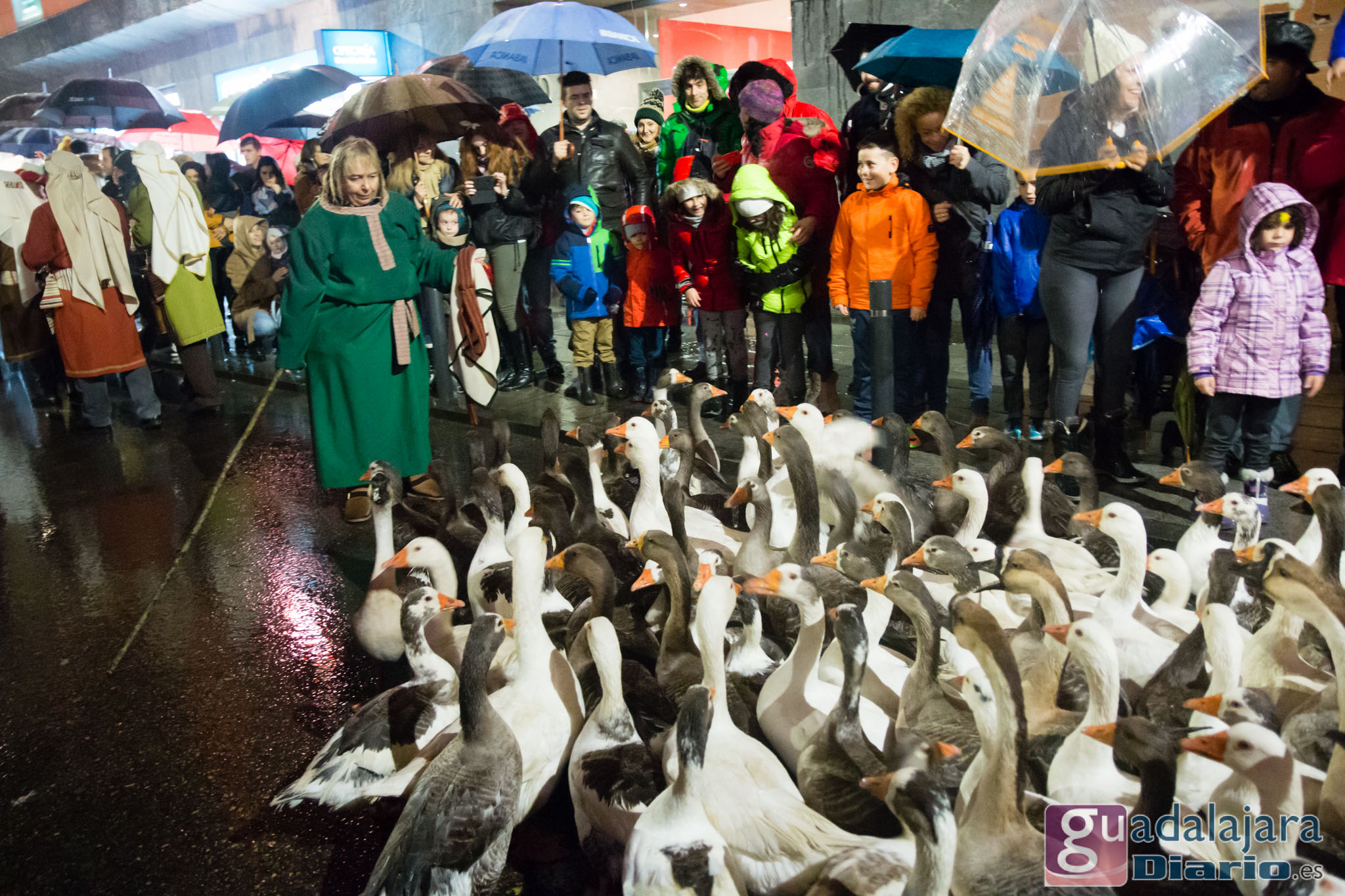 Un centenar de ocas desfila por el paseo de Las Cruces ante una multitud de espectadores protegidos por paraguas./ Fotos: GuadalajaraDiario. Los Reyes Magos trajeron uno de los deseos más pedidos en el 2017 que hemos dejado atrás: la lluvia. Por ello nadie se arrugó. A pesar de que estuvo lloviendo durante toda la Cabalgata, fuentes de la organización comentaron a este digital que la asistencia en las calles ha sido similar a los años anteriores: unas cuarenta mil personas. La tradición se cumplió en Guadalajara en todos los sentidos. Galería de imágenes en el interior.
