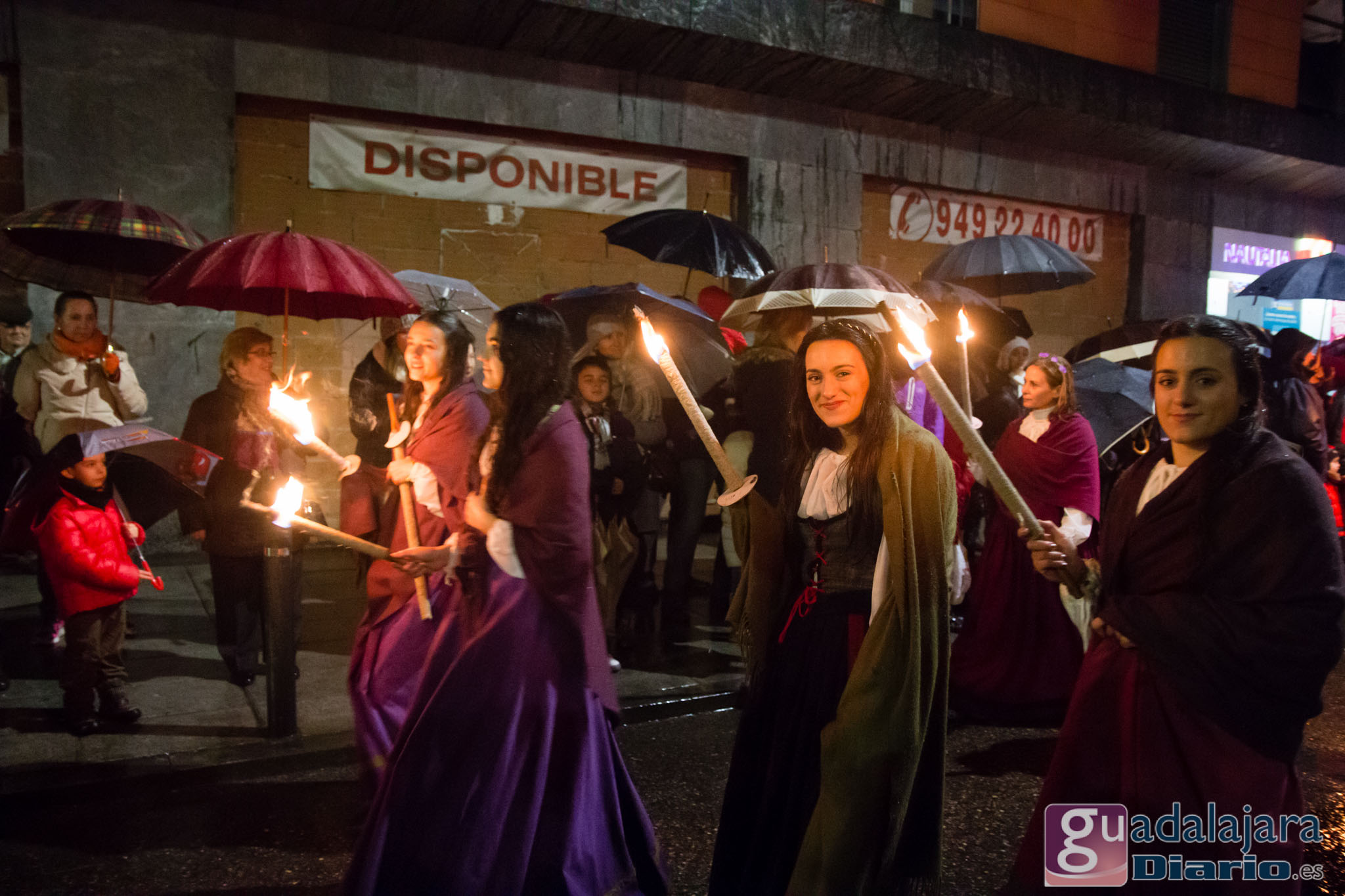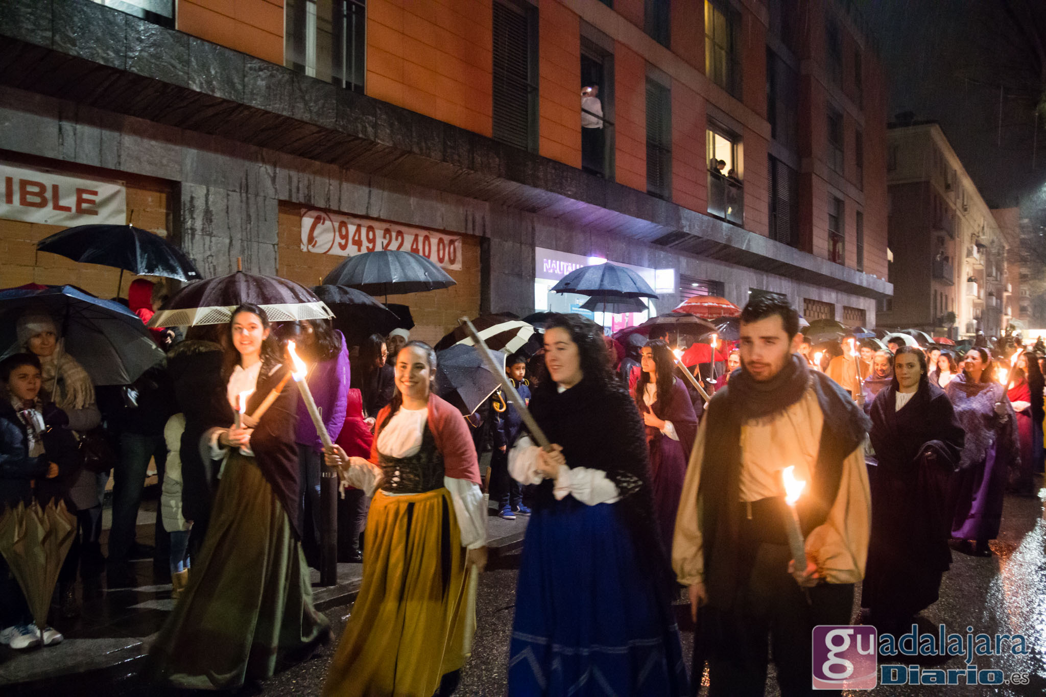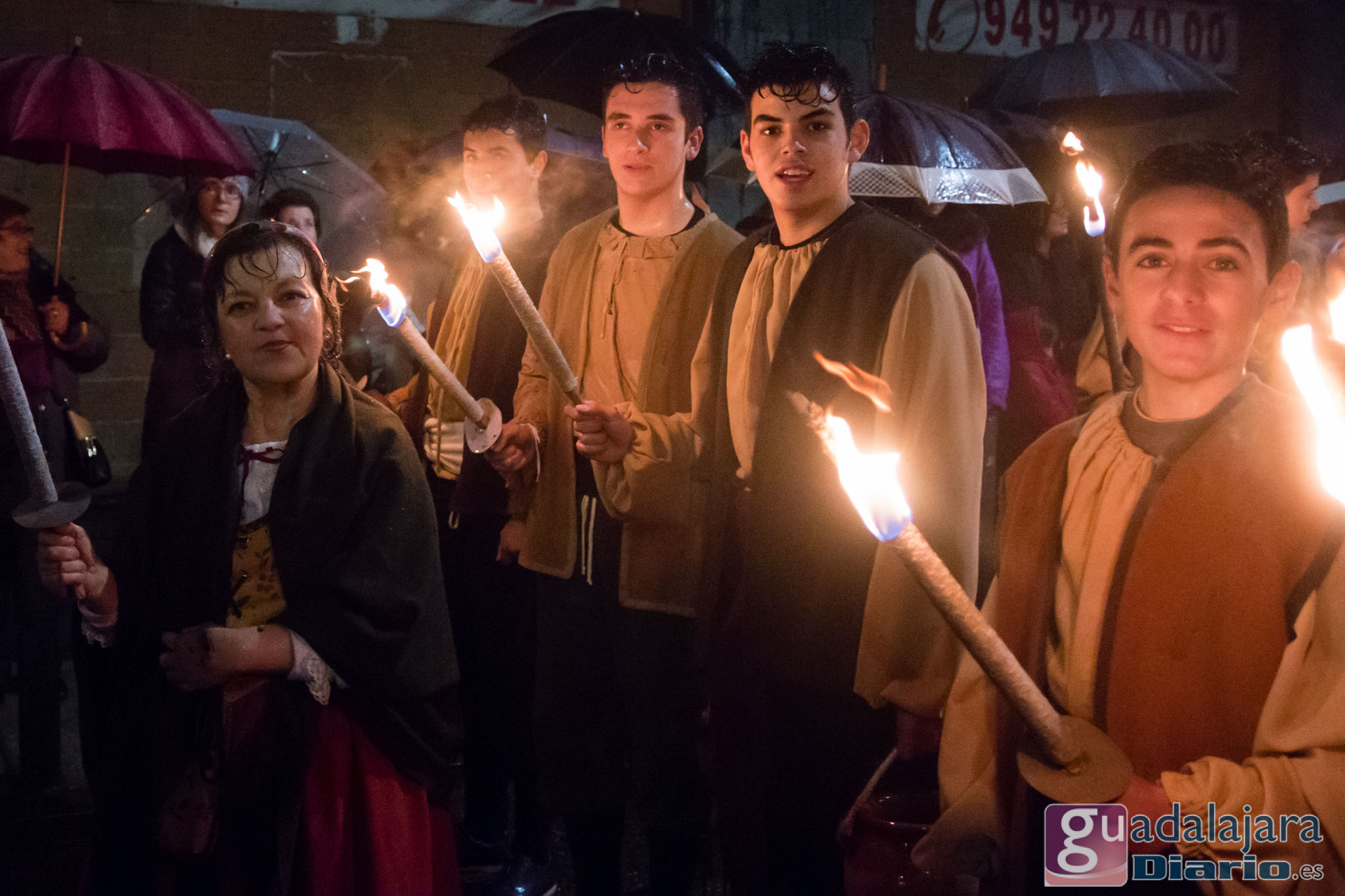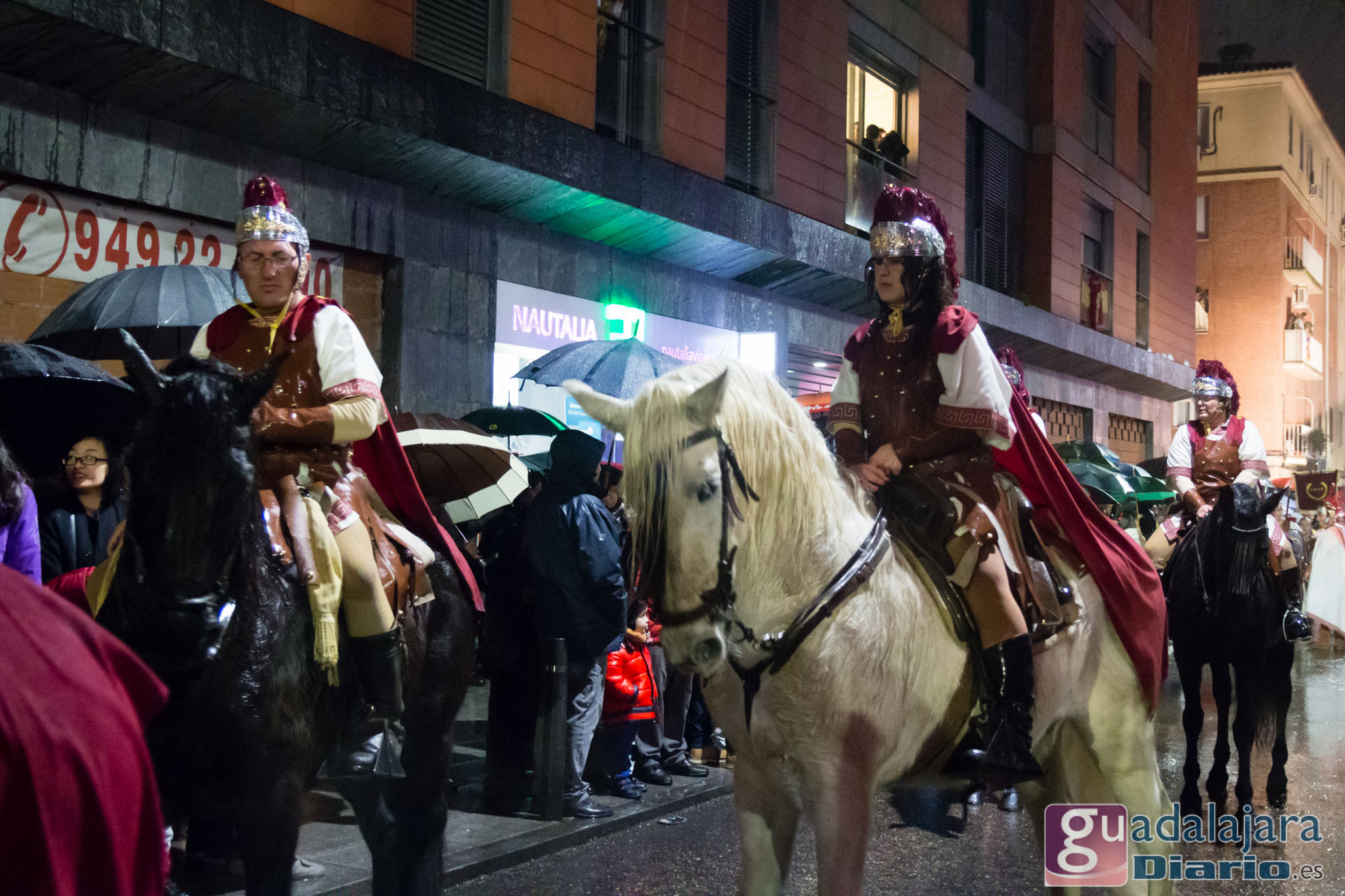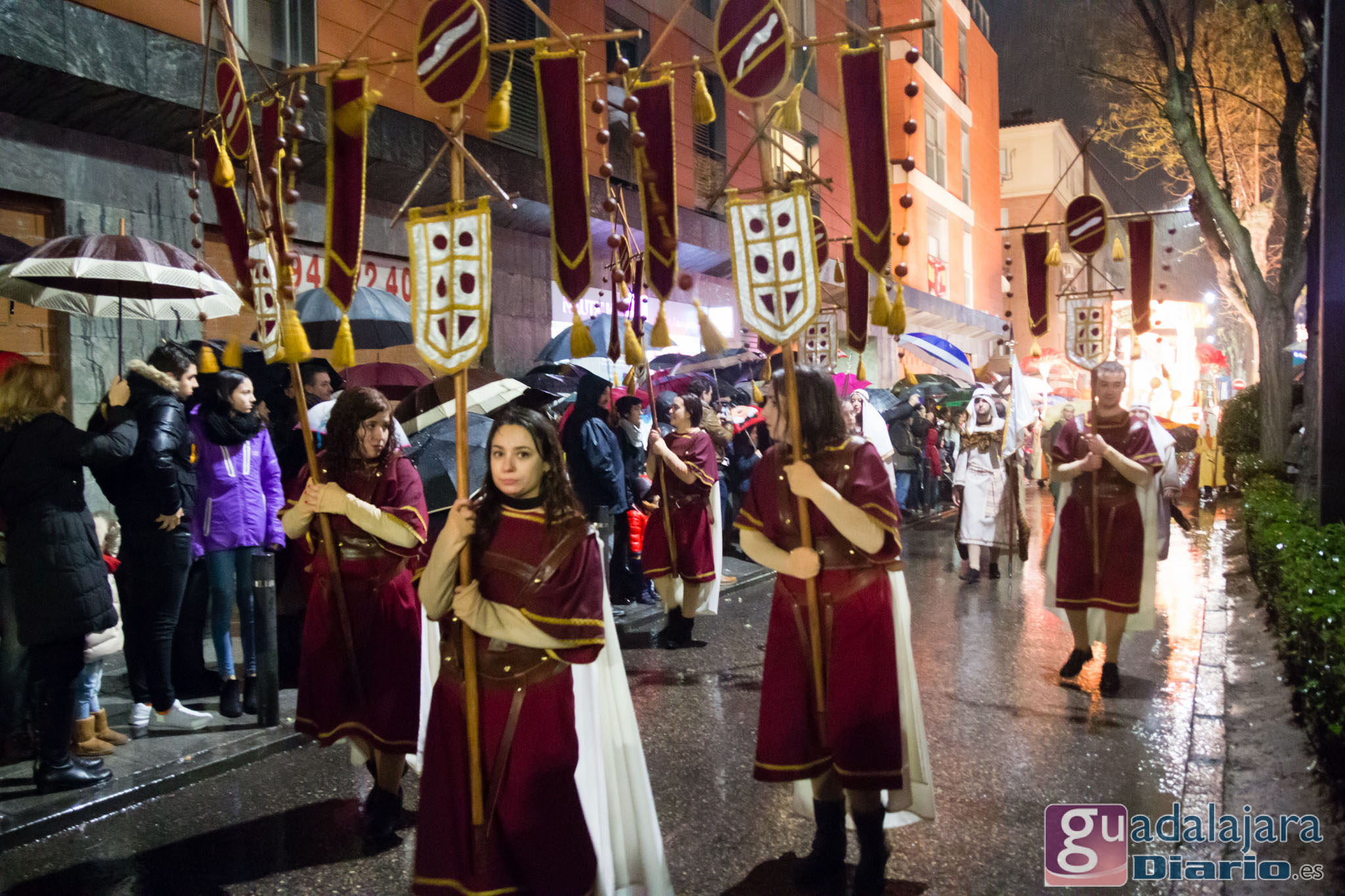 Por entonces, dulzaineros,pastores, romanos, pajes, soldados, hortelanos..todos menos los Reyes Magos, que tenían su carroza con toldo, estaban literalmente empapados. Pero cuando hay miles de personas esperando en el recorrido, muchos de ellos niños, desafiando al aguacero, no hay quejas que valga. Y por ello todos los que participaron en la Cabalgata, unas trescientas personas, cumplieron con gran profesionalidad. La tradición nos enseña que jamás se ha suspendido una cabalgata en Guadalajara, por el mal tiempo. En este año 2018 tampoco. Algunos llegaron con las ropas descoloridas, per llegaron.