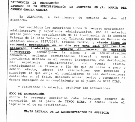 Esta diligencia es fruto de la providencia dictada por la Sala Tercera de lo Contencioso-Administrativo del Tribunal Supremo y en la que visto el recurso de casación preparado por el letrado de la Junta de Comunidades se declara "su inadmisión a trámite" del mismo por "falta de fundamentación suficiente" que permita la casación solicitada. Además, el TS condena a costas a la parte recurrente, la Junta de Comunidades.