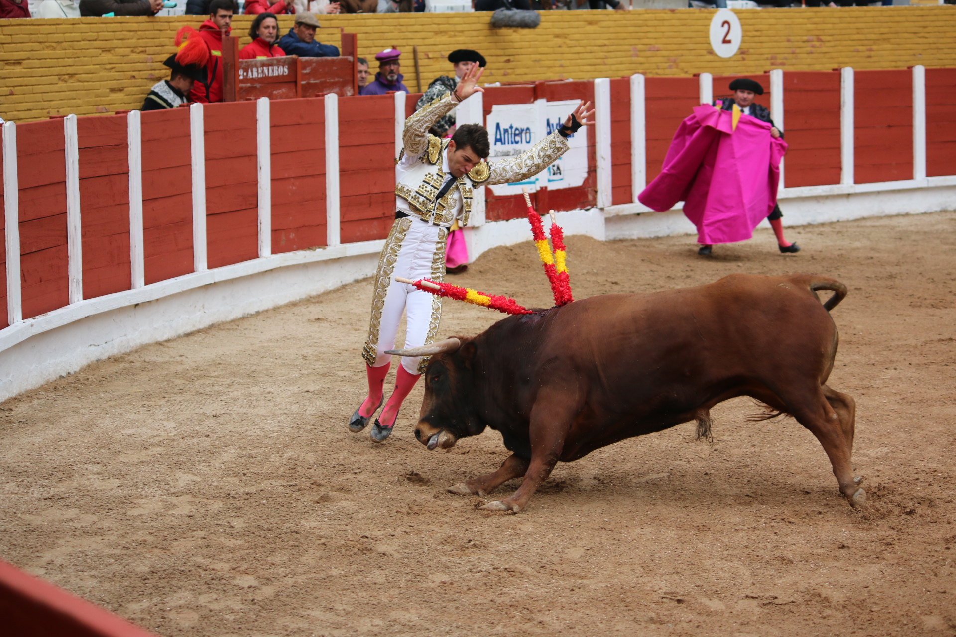 Primera de la mini Feria de Primavera. Un quinto de plaza escaso. Tarde muy fría, ventosa y con lluvia al principio del festejo. Se dosmonteró en el quinto novillo Roberto Ortega. Los tres diestros se presentaron en la plaza. Henche y Hernández salieron en hombros.Víctor Henche, bajando la mano. /Guadalajara Diario.