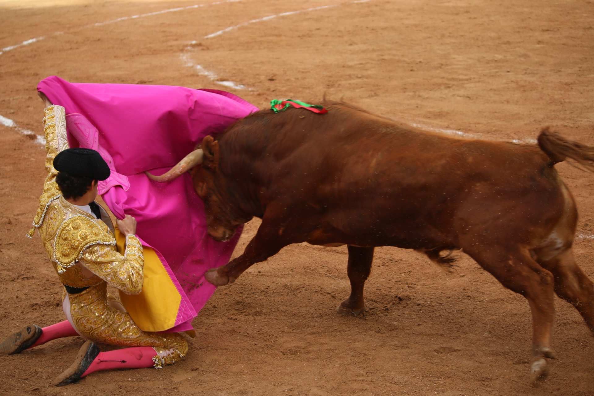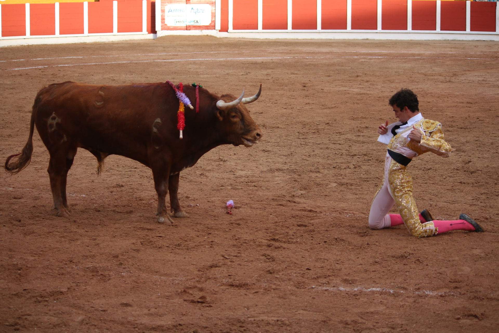 Ayer estuvo demostrando cosas más que enseñando su toreo. Le faltó continuidad en sus faenas y le sobraron enganchones. Dos faenas distintas en la que su mayor virtud fue hacer buenos el lote más deslucido. Olvídense de las orejas. Victor, al capote y de rodillas, intenta parar al novillo en el primer tercio./Guadalajara Diario
