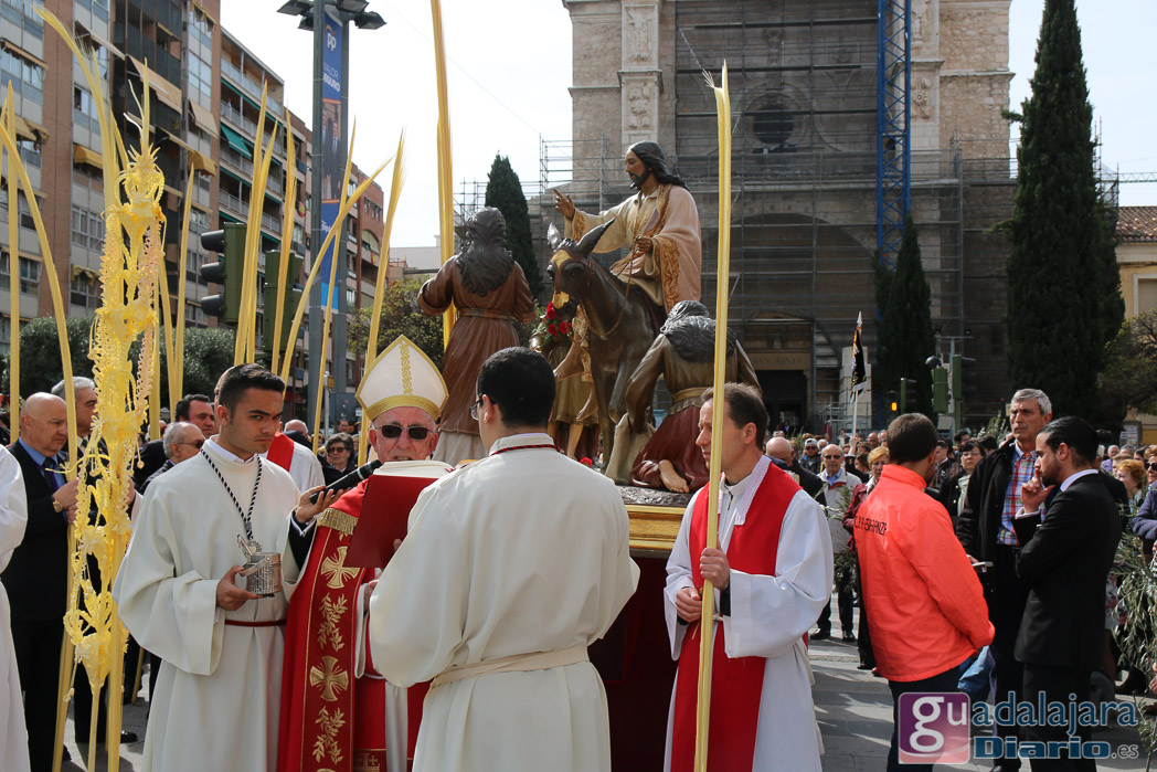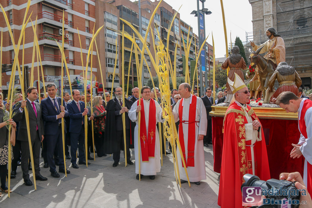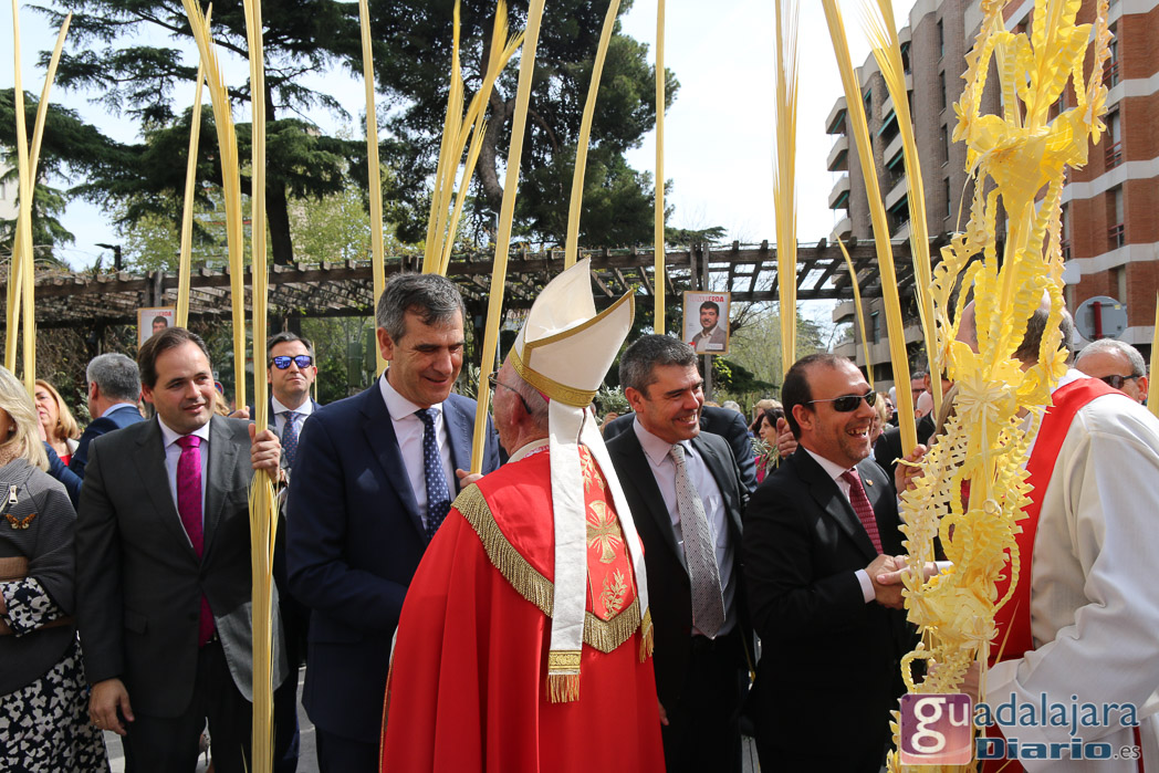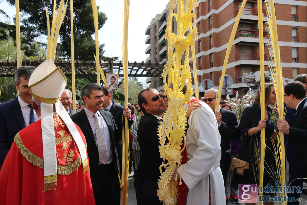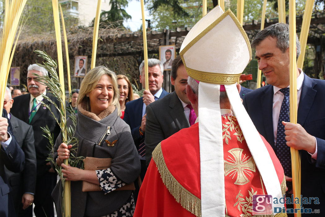 Centenares de personas se dieron cita en una mañana muy agradable en la San Domingo para la bendición de Palmas y Ramos, realizada por el obispo de Sigüenza-Guadalajara monseñor Atilano Rodríguez, que esta vez no pudo hacerse en la puerta de San Ginés, por las obras del templo, y se trasladó a la plaza.