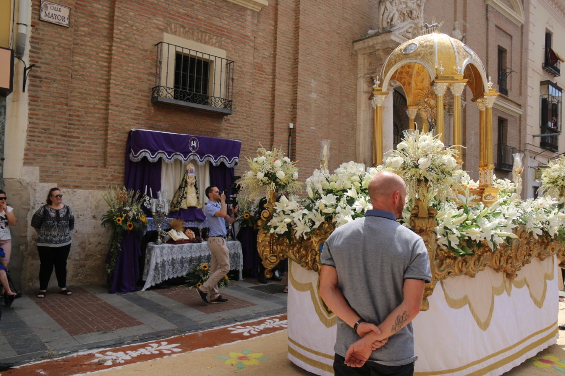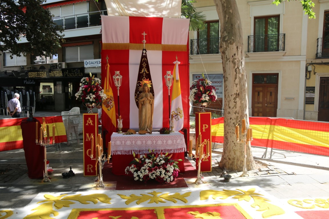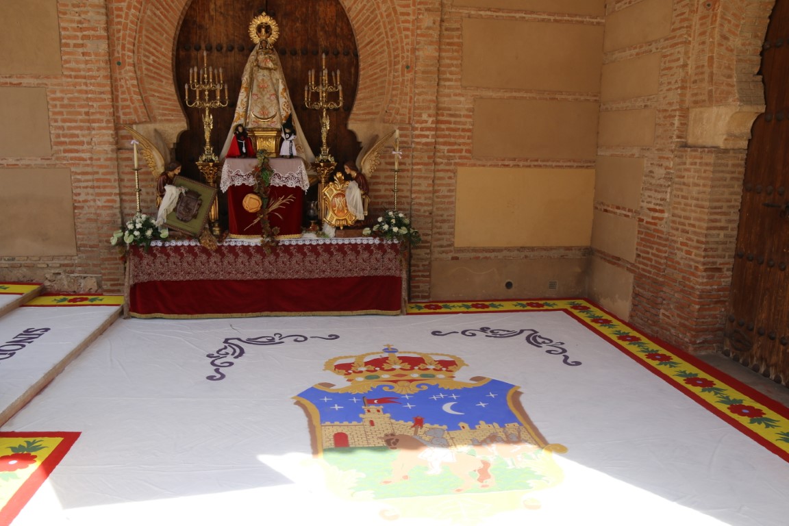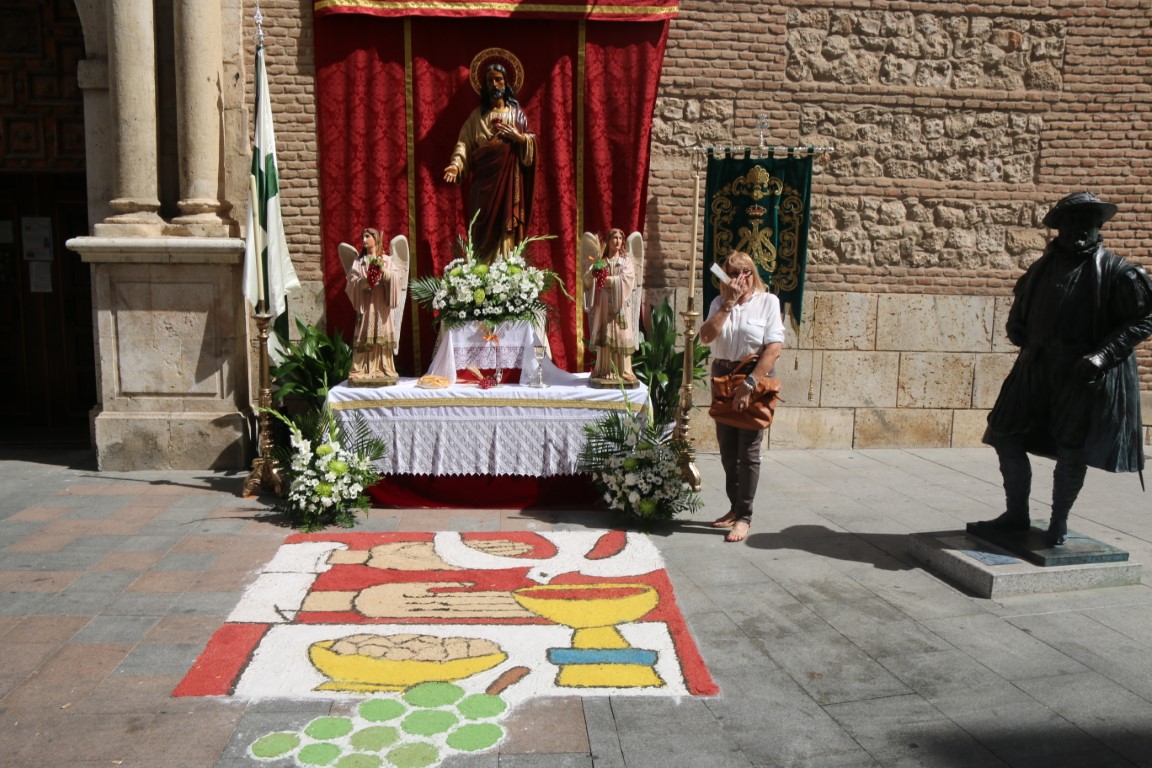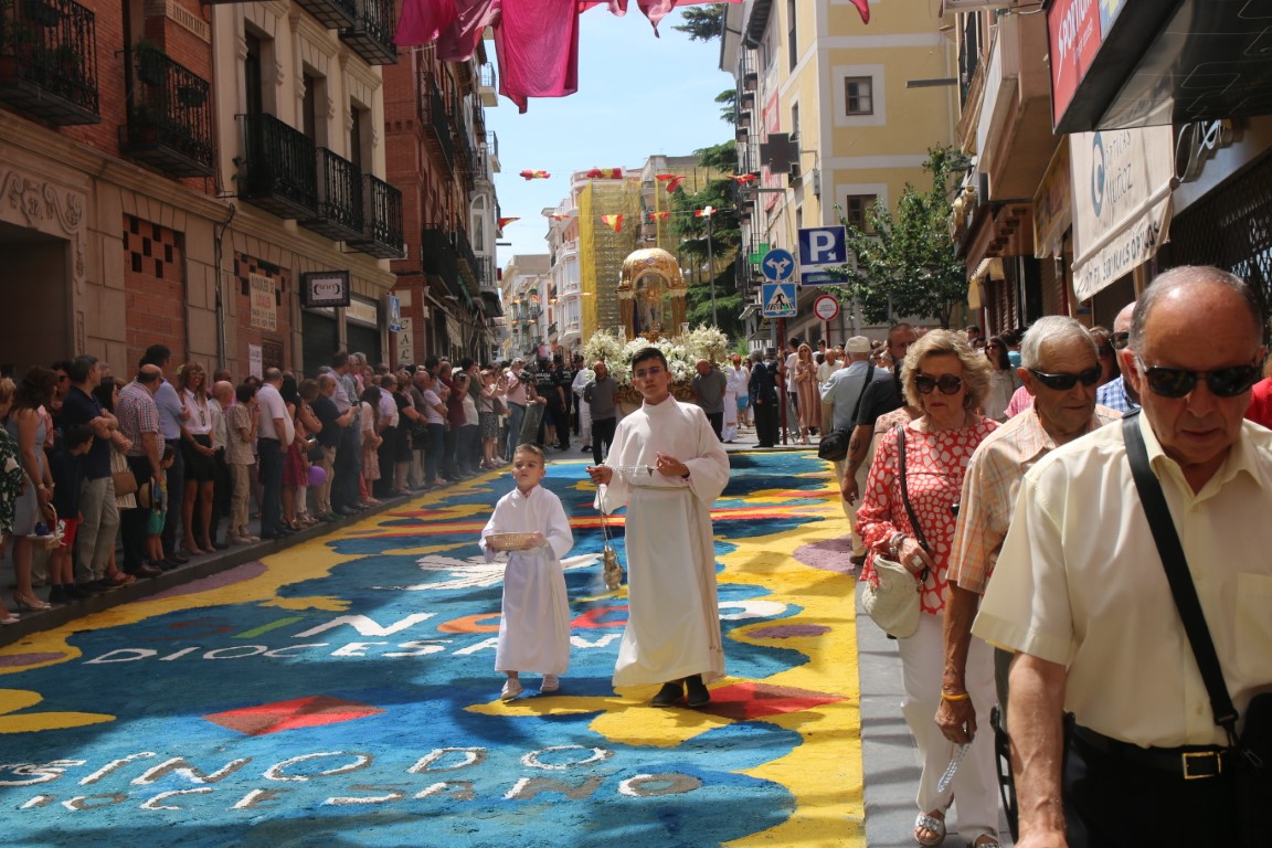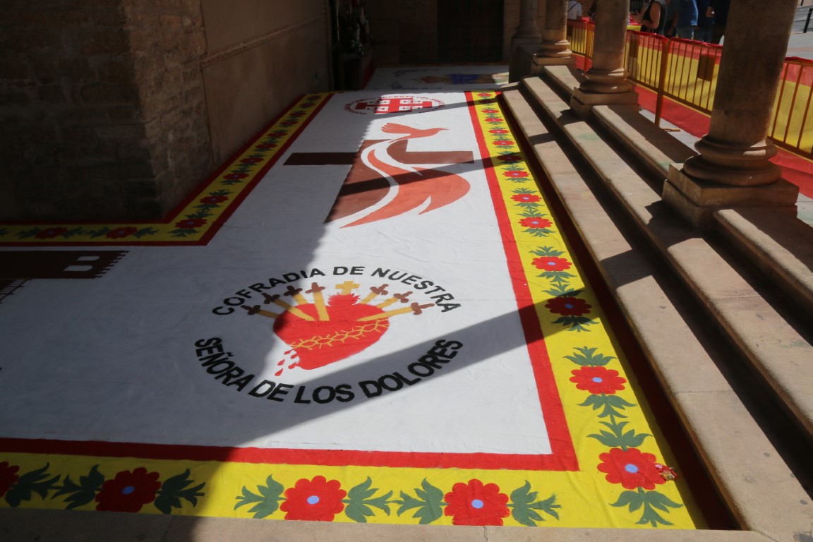 La carroza pasa por la alfombra de Jesús de la Pasión. Foto: GuDiario.En la concatedral de Santa María la alfombra se coloca a lo largo del pórtico y es elaborada por las dos cofrafías parroquiales:Virgen de los Dolores y Santo Sepulcro. En San Ginés, la hermandad del Cristo del Amor y de la Paz elige uno de los laterales peatonales a la entrada de La Concordia. Bajando por la calle Mayor alta nos toparemos a la altura de San Nicolás con la alfombra de Nuestro Padre Jesús Nazareno y a unos diez metros la de la hermandad de la Virgen de la Soledad, con el rostro de la virgen. Finalmente en la calle Miguel Fluiters está la alfombra de una de las cofrafías más veteranas en estas artes ornamentales: la de Jesús de la Pasión, con varios elementos alusivos a la actualidad de la Diócesis, como es el Sinodo Diocesano o el aniversario de Manos Unidas. Tampoco faltó el 850 aniversario de la consagración de la catedral de Sigüenza en la alfombra de la concatedral de Santa María. O los escudos municipales de la ciudad.