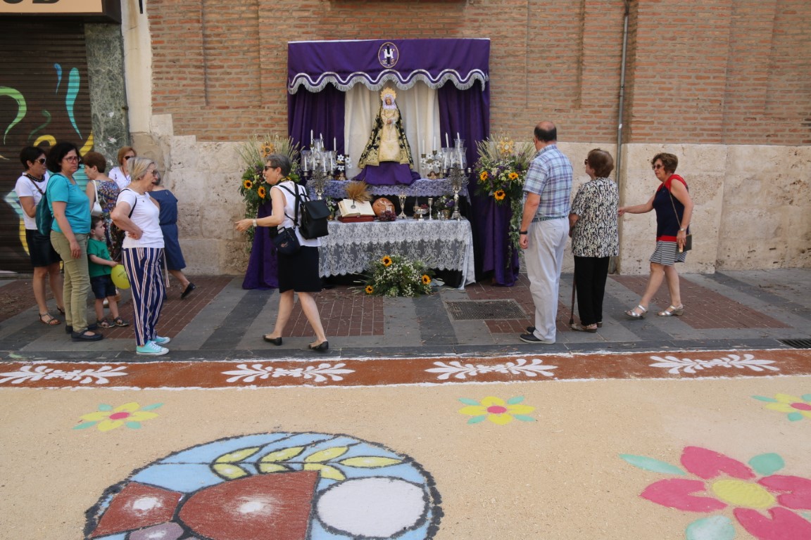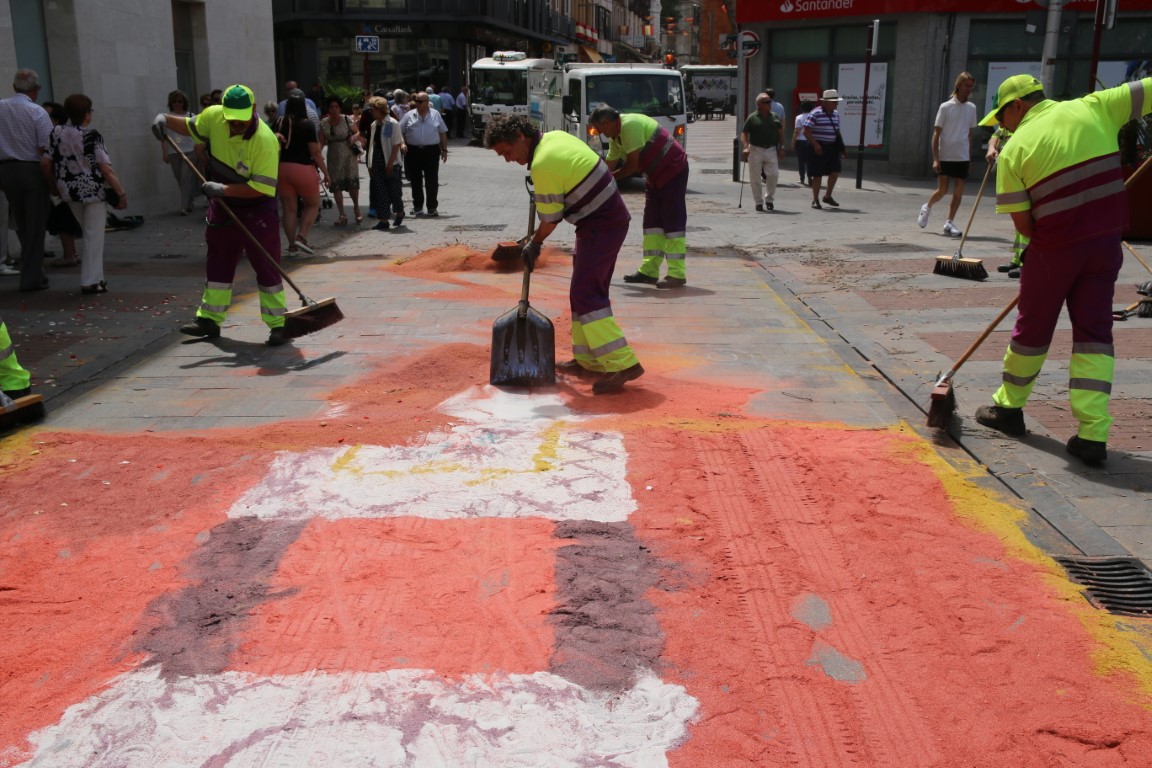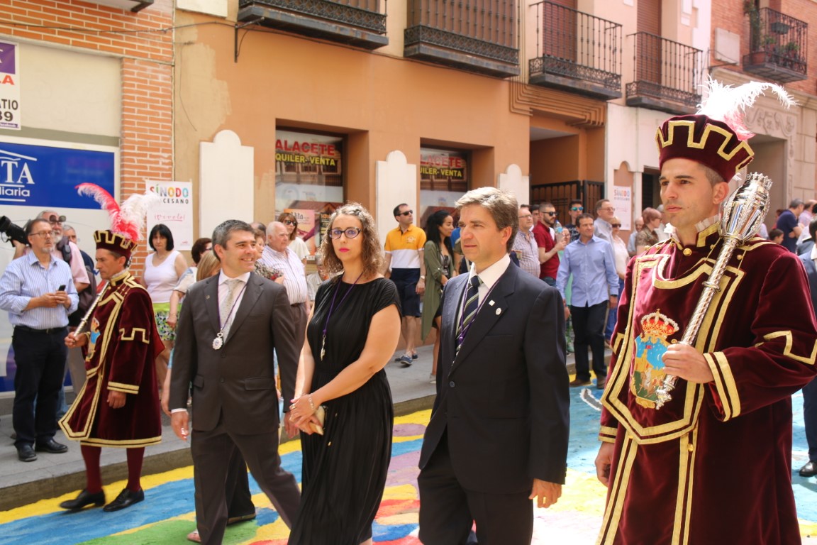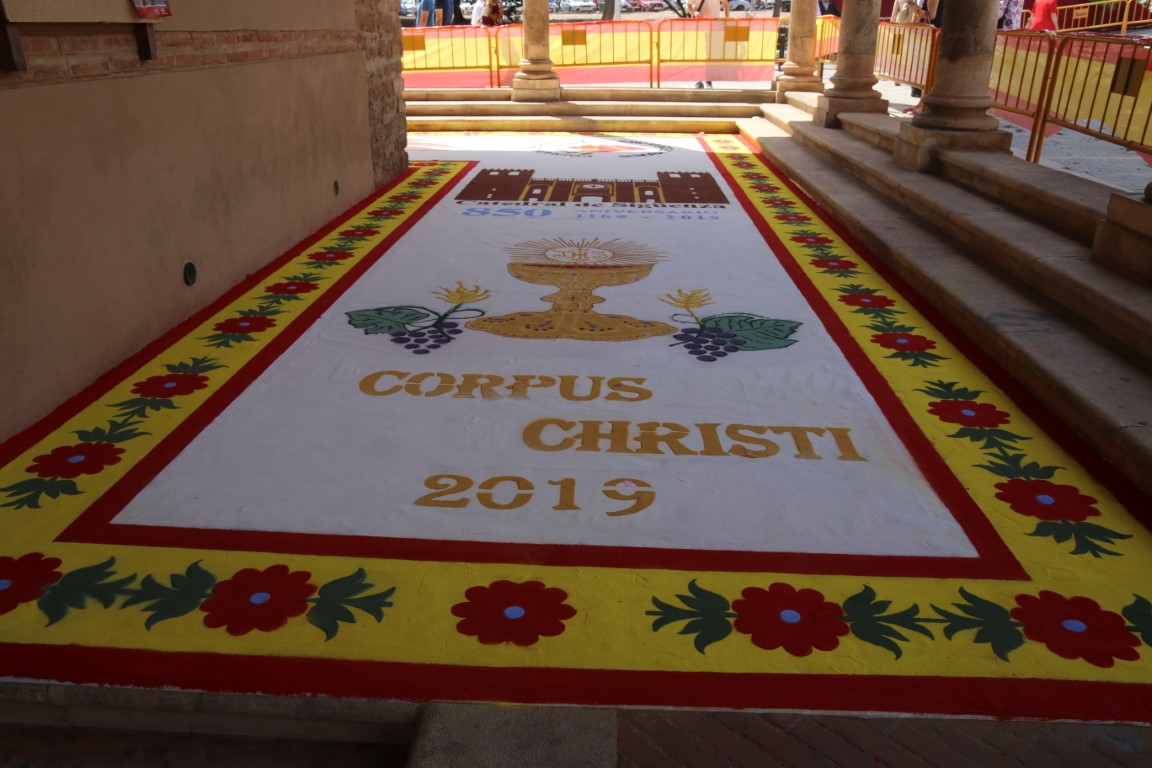 La ciudad tiene desde el día anterior aroma a fiesta grande. Las hermandades de Semana Santa han contribuido a realzar el Corpus arriacense sumándose todas ellas a una costumbre que en un principio solo fue de algunas. Nos estamos refiriendo a la elaboración de alfombras con serrín de colores, una tarea que se realiza durante la jornada del sábado. Así, cuando paseamos el domingo antes de la procesión podemos comprobar su feliz resultado.