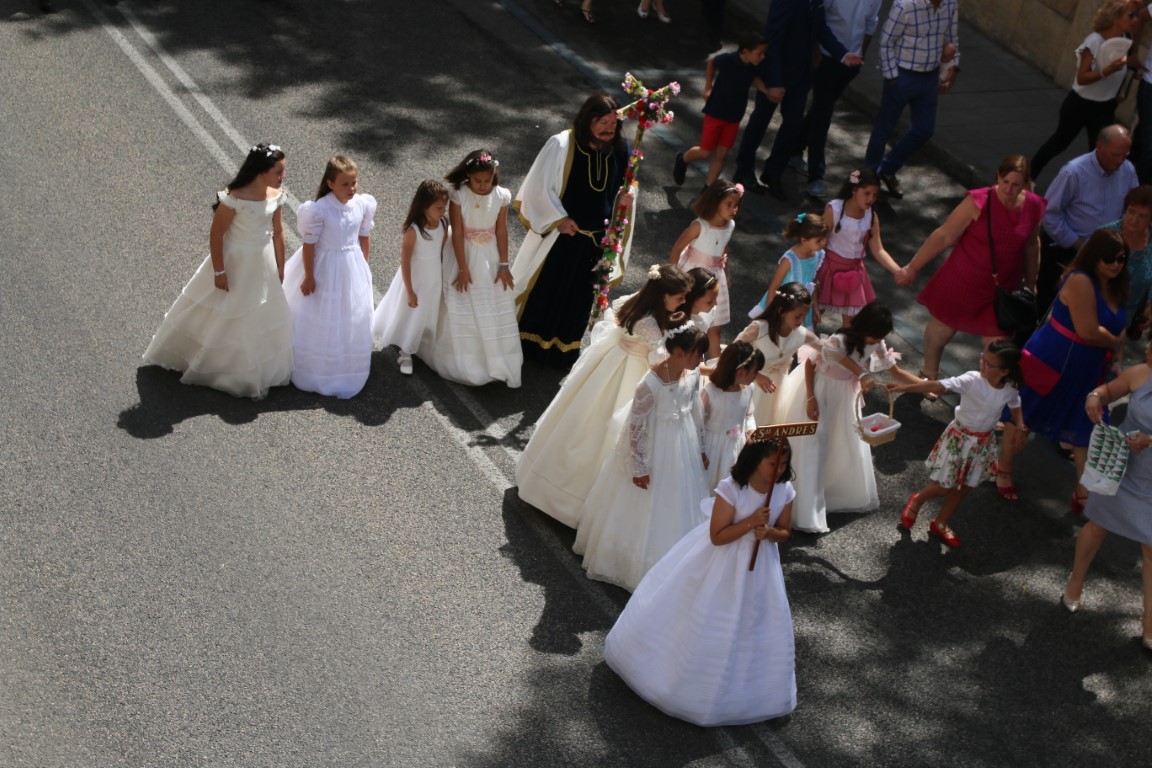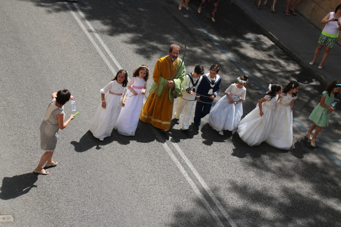 El acompañamiento de algunos niños por las familias durante la procesión desluce la marcha./GUDiario. La procesión, pues como siempre. Abrieron el desfile los niños y niñas con sus vestidos de comunión que acompañaban a los Apóstoles, encantadores todos ellos, lástima que algunos padres en su empeño de acompañarles organizaron un notable barullo que desluce la marcha. Hay que recordar que la de los Apóstoles, como nos enseña Gabriel María Vergara es una de las cofradías más populares de cuantas han existido en Guadalajara, que celebra sus ejercicios piadosos en la concatedral de Santa María de la Fuente la Mayor, donde se estableció hace siglos (según parece, fue creada en el siglo XV), contribuyendo anualmente con su asistencia a la procesión del Corpus Christi, en la que desfilan vistiendo trajes de época que representan a Jesús y los doce Apóstoles, llevando cada uno la insignia con sus atributos o señas martiriales. Los hermanos están obligados a cumplir diversas normas y preceptos. Antiguamente, los Apóstoles participantes en la procesión cubrían sus caras con unas máscaras de cartón, pintadas y con el nombre de cada uno de ellos, denominadas "rostros”.