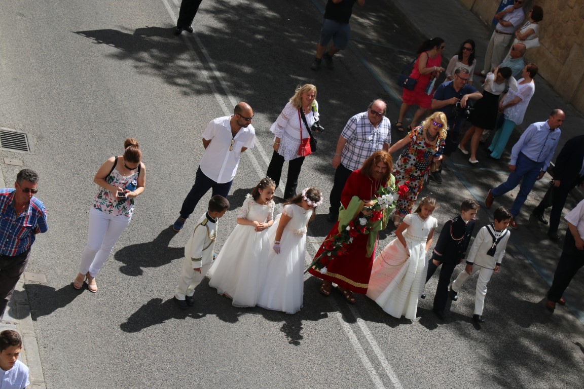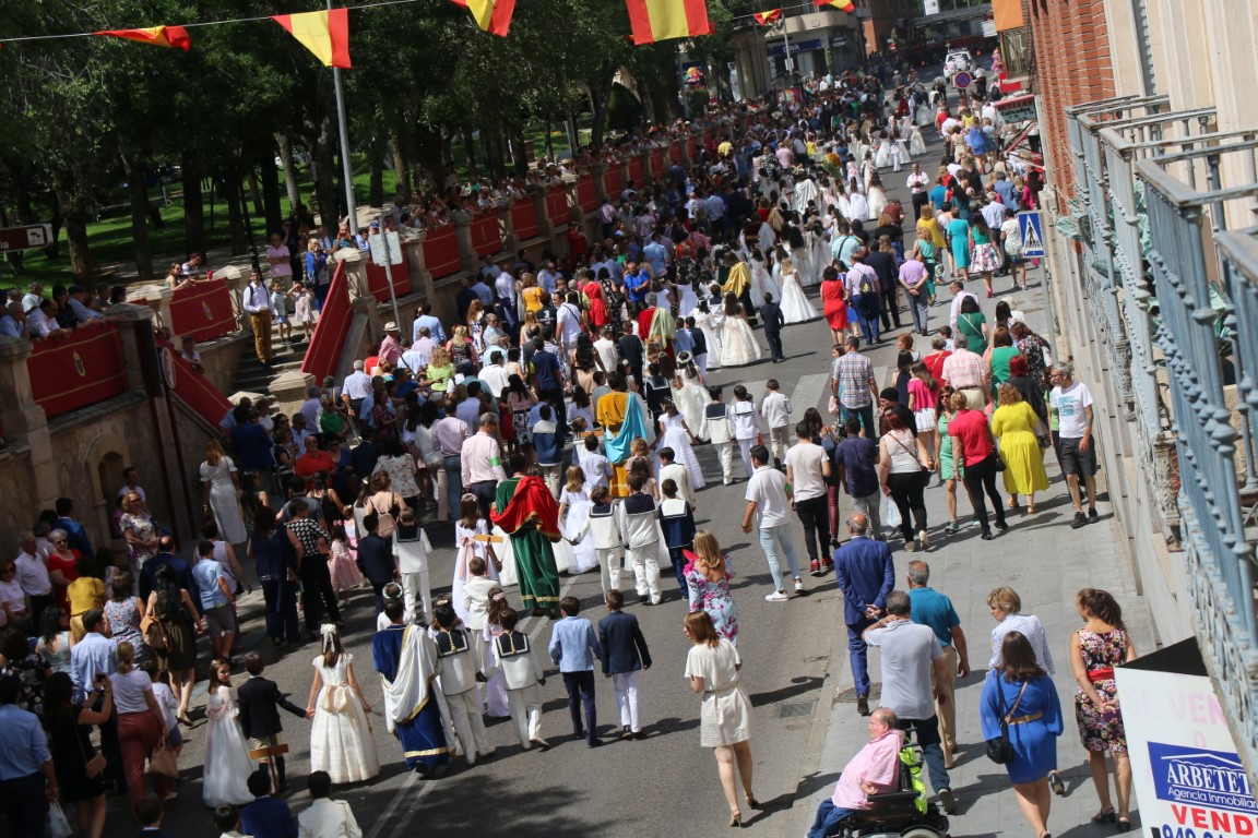 Decenas de niños y niñas de comunión acompañaron a la hermandad de los Apóstoles en la procesión del Corpus Christi, la primera en la que participa el nuevo alcalde Alberto Rojo que asistió acompañado de Pablo Bellido, el flamante presidente de las Cortes de Castilla-La Mancha. Galería de imágenes y video en el interior.