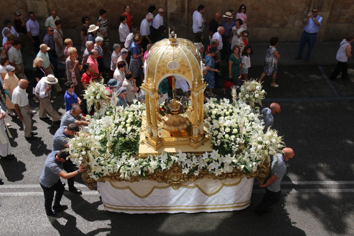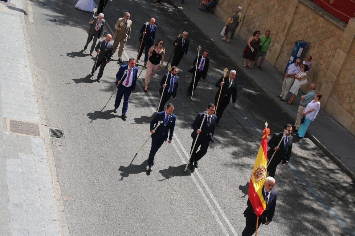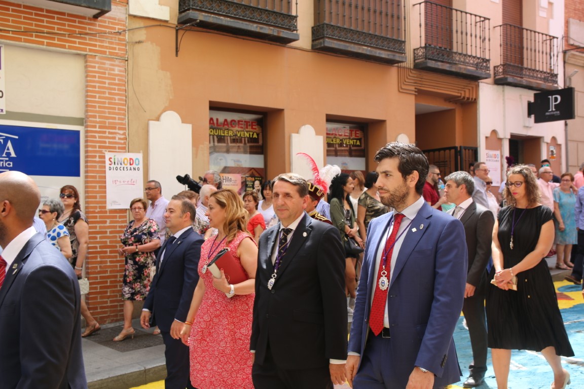 Fuera del grupo en que desfilaron los concejales de la nueva corporación, una fila en lugar destacado y con escolta de maceros estaba formada por Riansares Serrano, Santiago Baeza, Sara Simón y Rafael Pérez-Borda. ¿Serán los futuros tenientes de alcalde? Sabemos que habrá cuatro tenientes de alcalde, uno de ellos Pérez Borda (CS) y que Riasares, que es senadora, será solo concejal. /GUDiarioEl último tramo de la procesión está reservado a la representación de las cofradías, a cargo de los hermanos mayores, convenientemente trajeados y precedidos de los estandartes de cada una de ellas. Tras las carroza con la custodia marcha la representación religiosa que ete año ha estado encabezada por el obispo de la Diócesis monseñor Atilano Rodríguez, quien ha sido el encargado de dar la bendición eucarística en la plaza de Santa María al terminar la procesión.