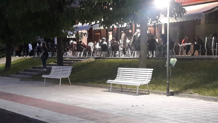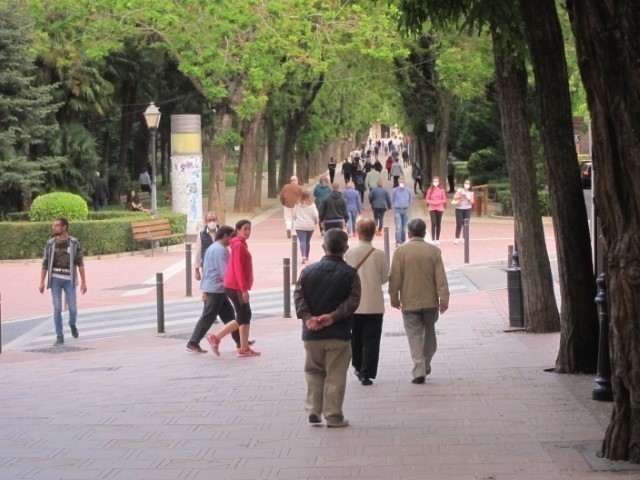 En la plaza Mayor seguía abierta la terraza de la cuesta del Reloj y se había sumado "La Favorita", que había sacado varias mesas y banquetas en la calle, con la clientela ocupando todos los espacios. En vías urbanas, avenidas y parques mucha más gente paseando o corriendo que por la mañana y una impresión general: a los grupos de jóvenes les cuesta mantener la distancia social y el uso de las mascarillas es muy poco extendido. ¡Vamos, que no se llevan!
