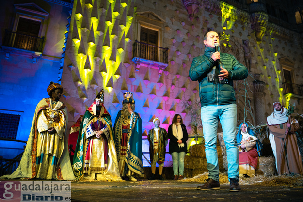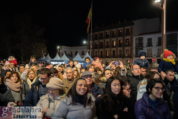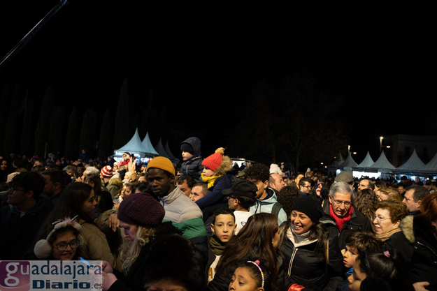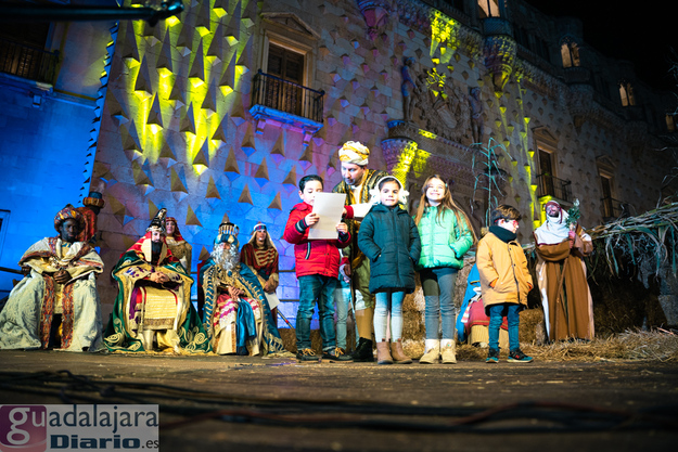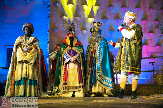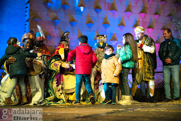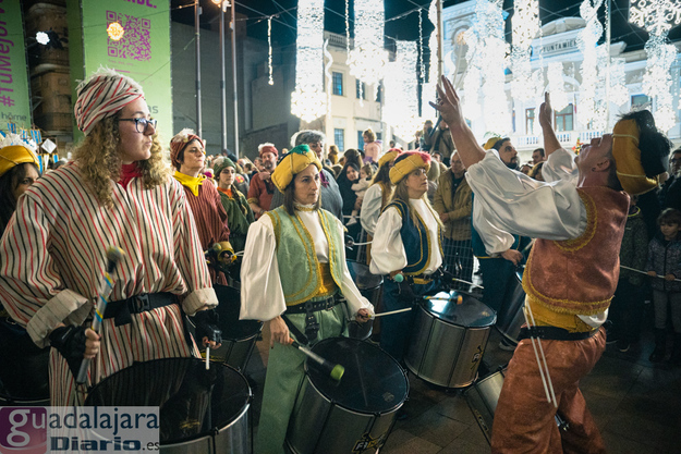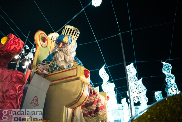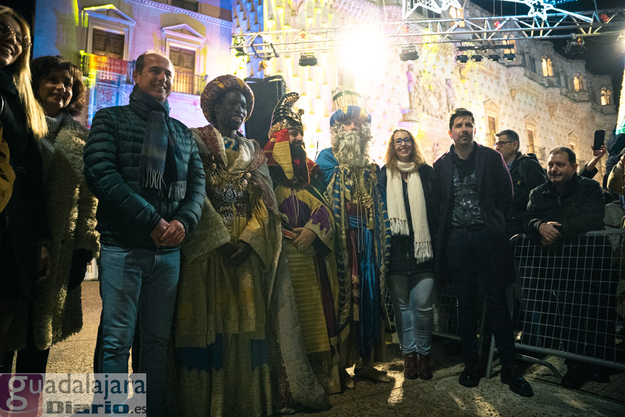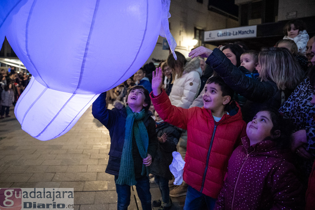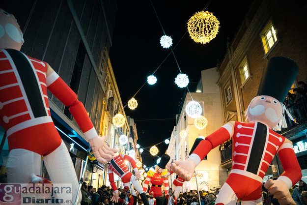 Lucía representa a los miles de niños de Guadalajara que como si en un cuento, espera con ilusión esta noche mágica para niños ... y mayores. Tras ella, la fantasía de los juguetes que han cobrado vida en esta cabalgata. Juguetes tradicionales que aparecen en sus sueños y que a buen seguro se hacen realidad en la mañana del día 6 de enero. Caballos mágicos, soldaditos de plomo gigantes, bailarinas, zancudos y una estruendosa batucada daban color a la cabalgata que precedía. Como ya ocurrió en otras ocasiones, no ha habido participación de animales vivos. Un total de más de 450 personas recorrieron el centro de Guadalajara hasta la plaza de España donde el alcalde y la corporación municipal recibieron a los Reyes Magos en su entrada en Guadalajara.