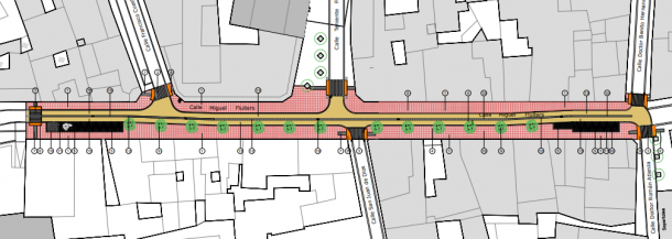 En la calle Miguel Fluiters se dotará de mayor espacio para el tránsito de peatones y zona de arboleda. Los coches podrán circular con limitaciones y ya no habrá plazas de aparcamiento.