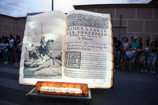 Foto: Eduardo Bonilla.Al comienzo del desfile solo un par de libros abiertos contenían los nombres de 'El Quijote', (nada que ver con Guadalajara en su texto) o alguna mínima frase dedicada al 'Viaje a la Alcarria' de Cela o a la 'Historia de una escalera' de Buero Vallejo, apenas perceptibles a la vista en la media y larga distancia.