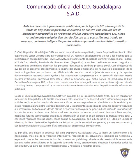 Supuestamente esta organización llegó a hacerse con el control del club de fútbol alcarreño, que como es sabido se trata de una sociedad anónima. En un comunicado oficial del Club Deportivo Guadalajara S.A. se asegura que tanto el club como el accionista mayoritario, "Lener Emprendimientos S.L., filial española de Lener Constructora SA y Grupo Dinal SA, resultan absolutamente ajenas a los hechos que se investigan en el expediente Nº FSM 45206/2023 en trámite ante el Juzgado Criminal y Correccional Federal Nº2 de San Martín, Provincia de Buenos Aires (Argentina) y no han realizado acciones, negocios o intercambios de ninguna clase con las personas identificadas en dicho proceso penal. Con el objetivo de ayudar en el presente procedimiento, la matriz del grupo empresarial se ha puesto a disposición de la Justicia Argentina, en particular del Ministerio de Justicia con el objeto de colaborar y de aportar documentación requerida para ayudar a las autoridades competentes en la resolución del caso. Desde nuestra institución, queremos lamentar el daño reputacional que dicha noticia ha producido al Club Deportivo Guadalajara SAD, sobre todo cuando las actuaciones judiciales se encuentran bajo secreto de sumario y la matriz empresarial se ha mostrado totalmente colaboradora con las peticiones de información judiciales".