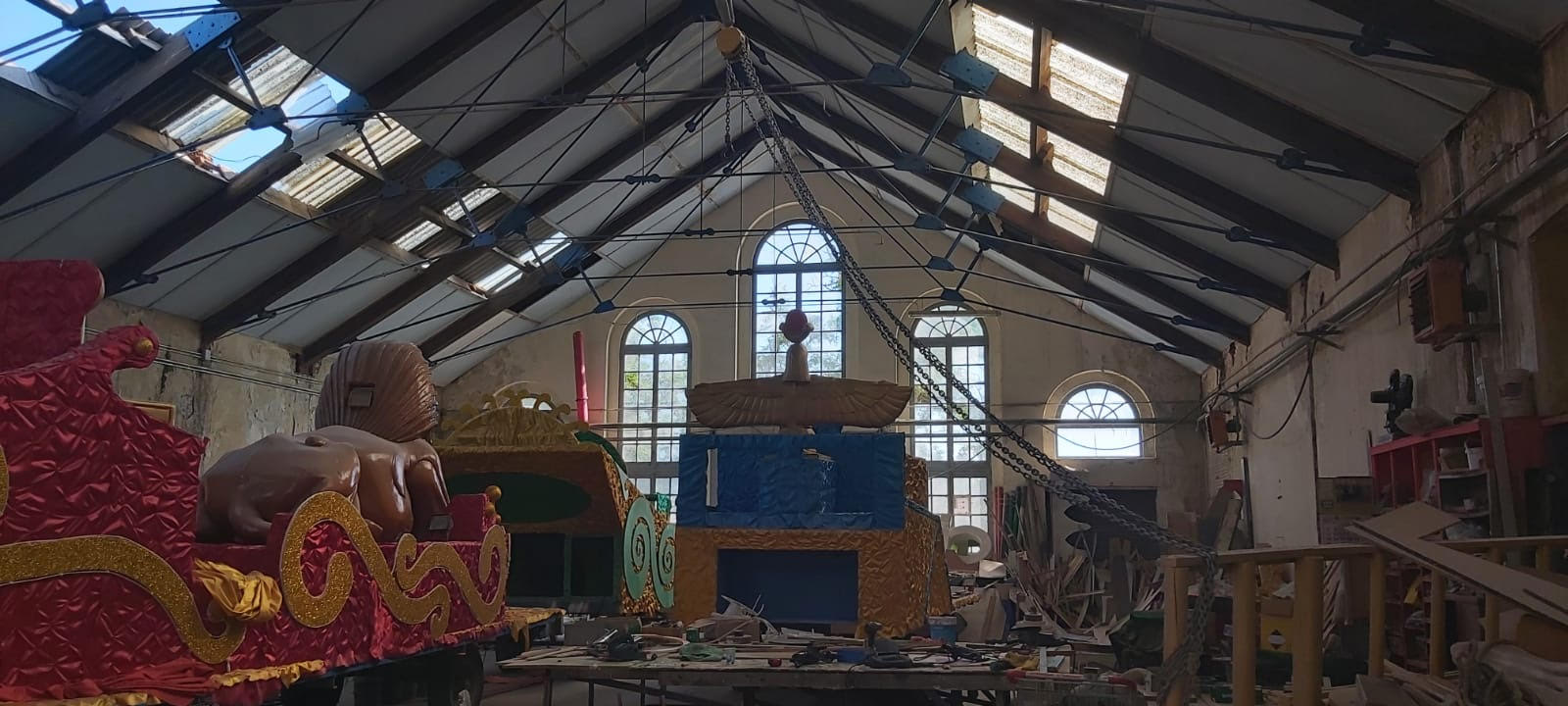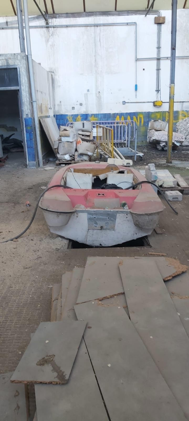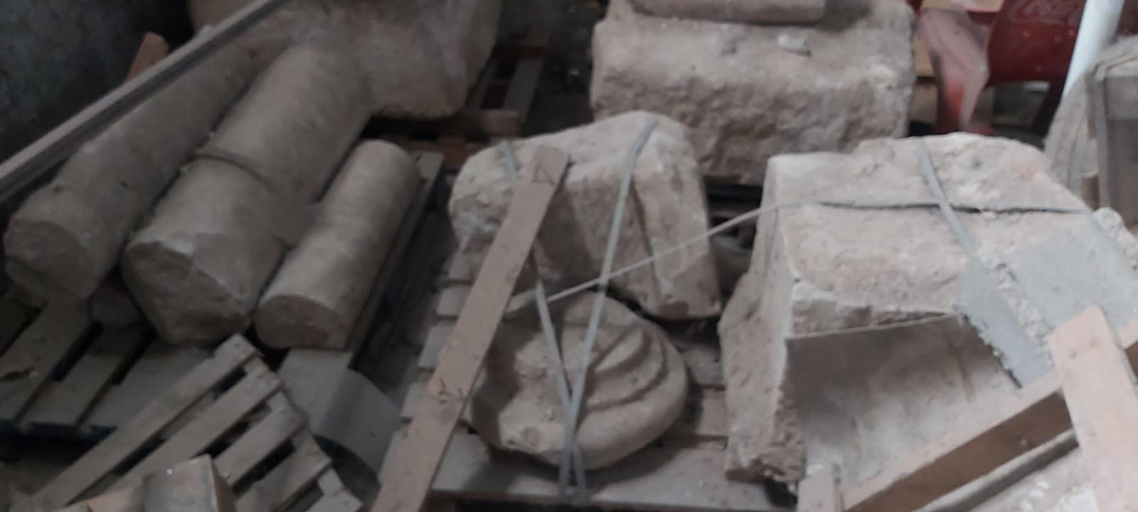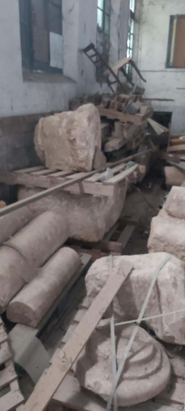 En las decrépitas naves se almacena (tirado y revuelto) de todo: restos arqueológicos sin estudiar ni catalogar, las máquinas industriales antiguas del TYCE que en muchos casos son materiales de ingenieria únicos en España, bancos de la antigua iglesia, maderas, herramientas, hierros, una barca de color rosa, vallas, andamios, maderas, sillas y mucha porquería, polvo y suciedad.