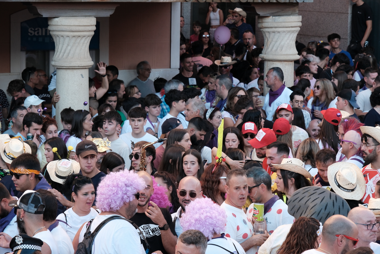 Y como hoy era el día de las peñas de Guadalajara, la encargada de pregonar este año era la peña Bizcocho Borracho, que cumple su 25 aniversario. Con una Torre del Reloj 'enfundada' por primera vez en la historia, los miles de peñistas esperaban que a través del ojo que han dejado los andamios dieran la ocho campanadas y que el presidente de la peña homenajeada, Miguel San Andrés, comenzase su pregón.