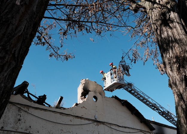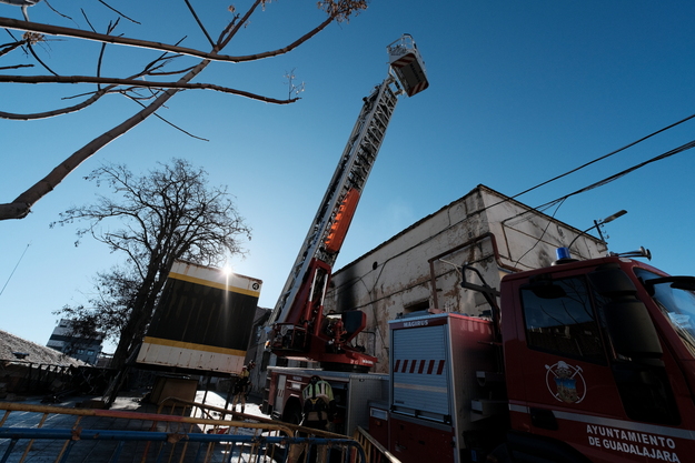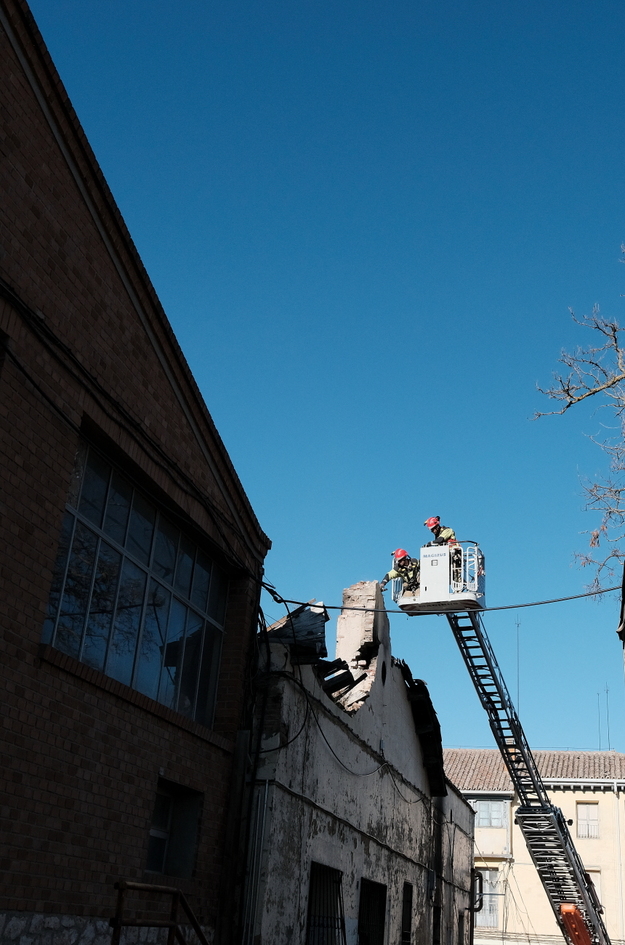 Han estado toda la mañana desde primera hora revisando las estructuras, tanto de muros como de las pobres vigas que aun resistían en su posición aunque muy dañadas. Algunas cornisas y paredes han tenido que ser derribadas según la experiencia en prevención de riesgos de los bomberos de Guadalajara.