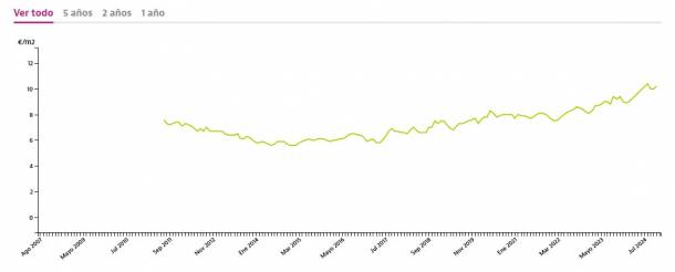 Si nos referimos al alquiler la situación es mucho peor, porque la oferta y la demanda está más descompensada: “Se alquila todo; al precio que sea, porque no hay pisos”, te dicen en las inmobiliarias. También referido al casco antiguo, los precios han ido escalando desde 2016, cada vez más, y a noviembre de 2024 se está pagando una media de 10,2 euros/m2 por ese alquiler.