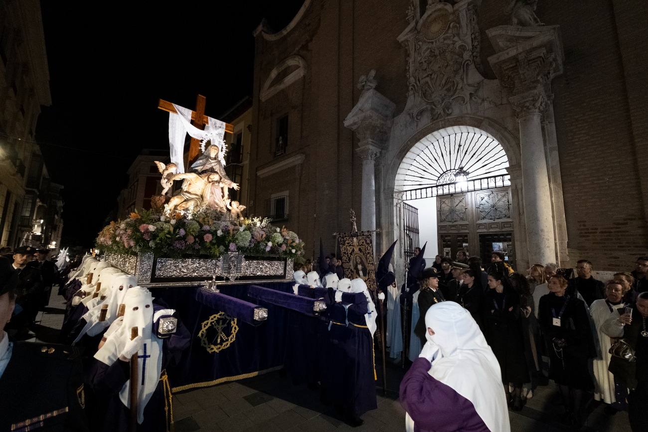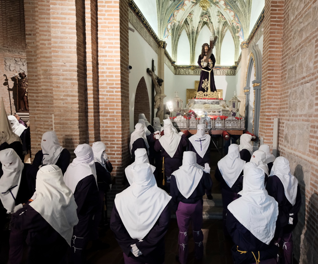 En la procesión de Jueves Santo, la más numerosa, los cofrades llevan una sencilla túnica morada, con cíngulo amarillo, y capirote blanco, que es sustituido por uno negro para la procesión del Silencio y Santo Entierro.