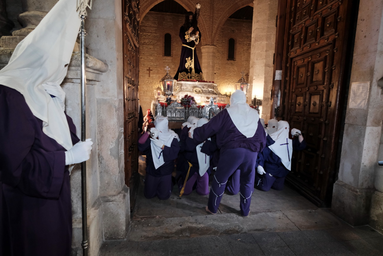 Casi cinco horas después, con el mismo complejo procedimiento de la salida, el cristo de la Pasión vuelve a entrar en la iglesia de Santiago, en donde la imagen permanecerá expuesta hasta el año siguiente.