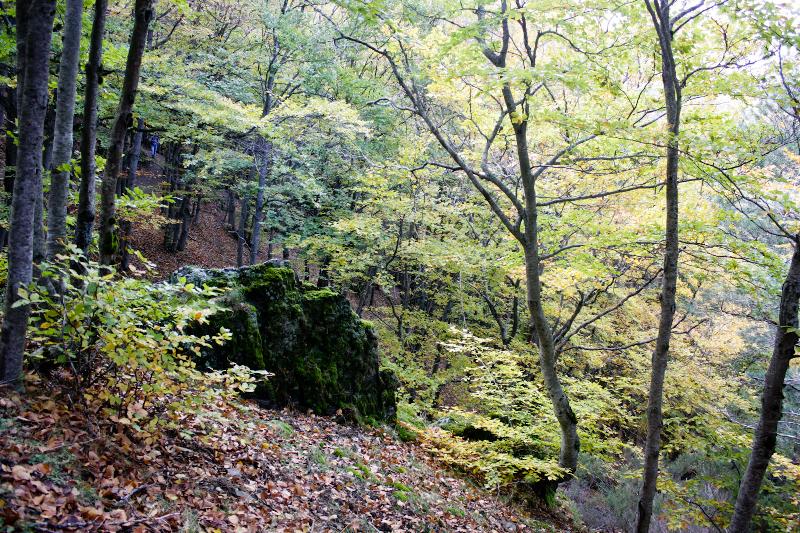 Al principio nos encontraremos con los robles, que aquí se llaman rebollos o melojos, de hojas lobuladas, que se resisten a caer hasta avanzado el invierno. La senda se estrecha hasta cruzar un arroyo y muy pronto el camino vuelve a subir por una zona de hayas largas y puntiagudas, en busca de los rayos del sol, que a duras penas se abren paso entre las copas de los árboles. A la izquierda encontraremos, señalizado, un magnífico ejemplar de tejo (foto de la izquierda) , árbol de madera muy resistente que se utilizaba para hacer arcos, y que puede llegar a vivir hasta 1.500 años. Como el acebo -cuyas hojas son típicas en las postales navideñas-, está protegido por ser escaso y de crecimiento muy lento.