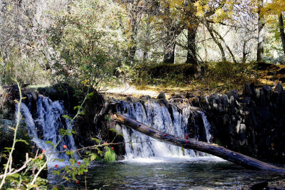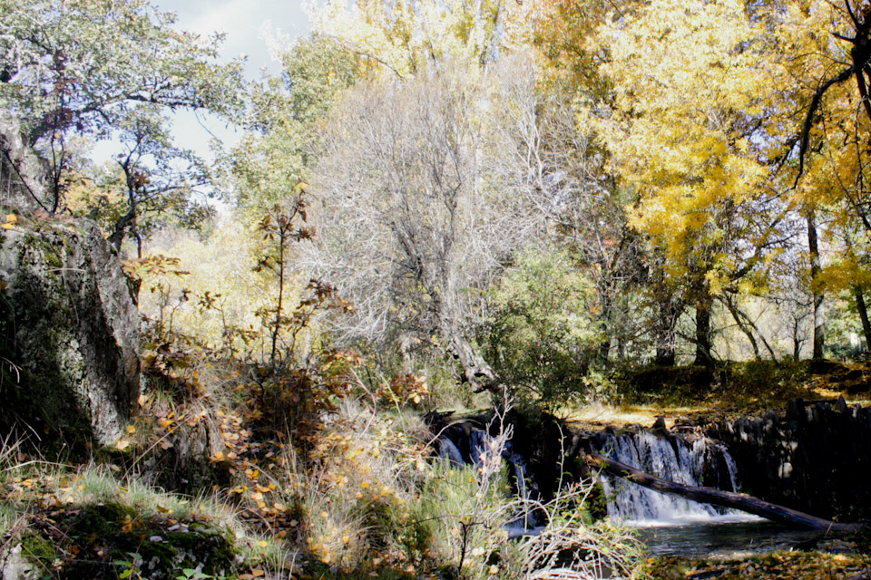 El pico Ocejón, atravesado por masas de robles cobrizos que van perdiendo su manto, lo domina todo desde que cruzamos el arroyo de la Matilla, pasados los primeros 80 kilómetros desde nuestra salida en Guadalajara. Es nuestra primera parada para fotografiar una represa formada por piedras y que provoca un vistoso salto de agua.