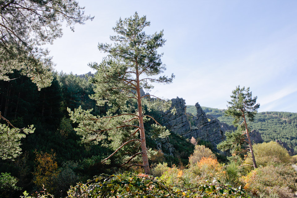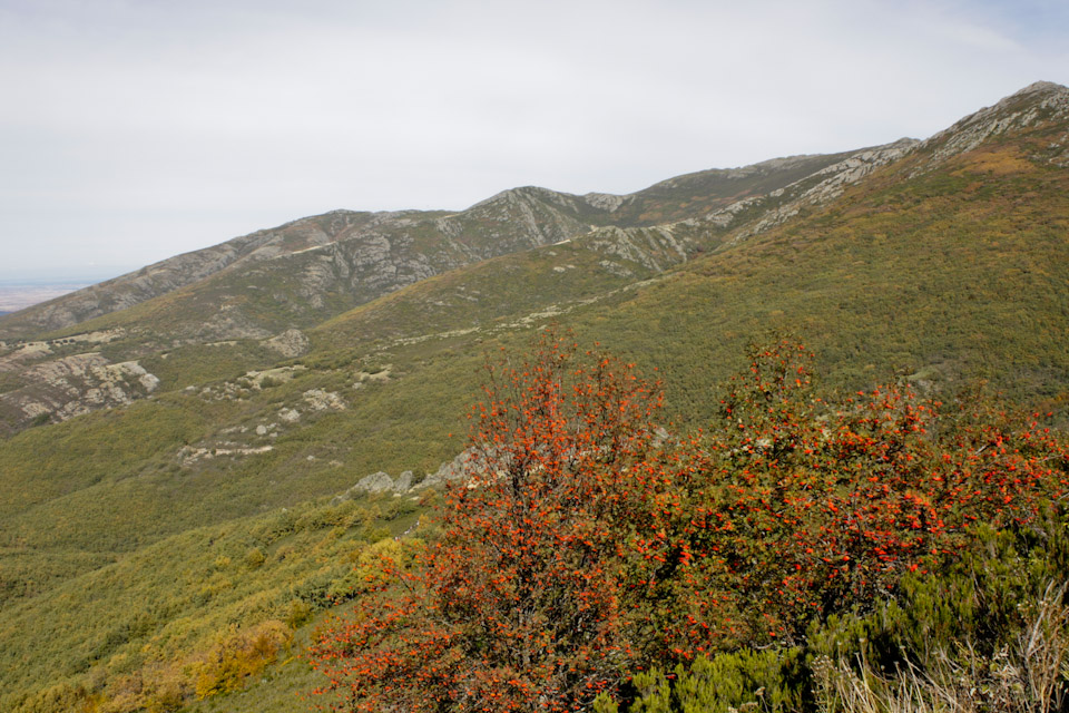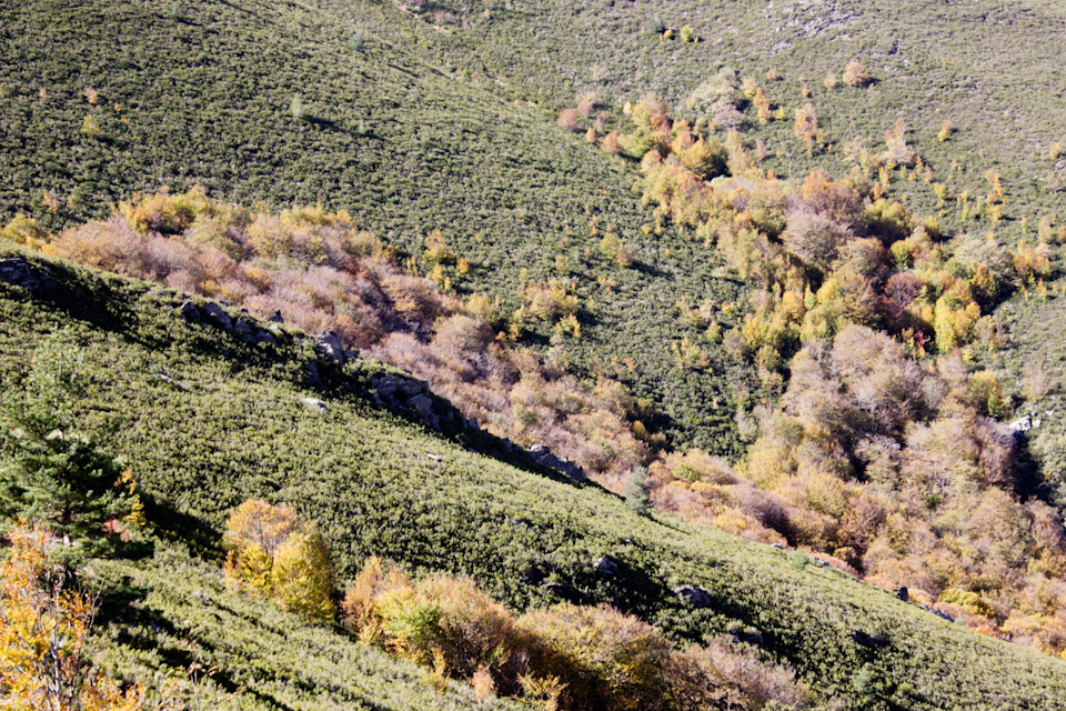 Cruzado el puente, todo es subir y subir hasta que superamos la falda de la montaña y entramos en otro valle. Ahora son los pinos la vegetación dominante, aunque pronto volveremos a encontrarnos con robles –aquí llamados melojos- que nos escoltarán hasta el final del viaje.