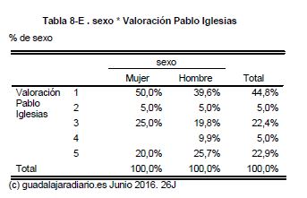 También aprueba el candidato de Unidos Podemos, Pablo Iglesias, que recibe una nota de 5,12 del 97,45% de encuestados que dicen conocerlo. Por grupos de edades, el 75,6% de los menores de 29 años le aprueba y el 51,2% además con sobresaliente. En cambio, entre los mayores de 65 años, el 66,7% le puntúa a Iglesias con un 1, cantidad que baja al 50% en la franja de 45 a 65 años.