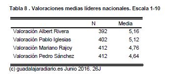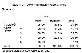 Albert Rivera, el candidato a presidente del Gobierno de Ciudadanos, es el que menos rechazo suscita entre el conjunto del electorado guadalajareño. Aunque todavía un 4,9% dice no conocerlo es el más mejor valorado con una media de 5,16 puntos sobre 10. Solo el 46,4% le puntúa con una nota inferior a 5. Rivera recibe la peor nota entre los jubilados (el 41% de dan un 1) y la mejor de 45 a 65 años (el 41,7% le da un 3).