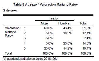 puntuación, 1. En el otro extremo están el 19,4% que le puntúa con un 5. Por grupos de edades, la peor nota la recibe Rajoy entre los jóvenes: el 75,6% de los menores de 29 le dan un 1; porcentaje que se reducen al 50% entre los de 30 a 44. Sube hasta 53,8 entre los de 45 a 65, y entre los mayores de 65 solo el 33,3% pone un 1 a Rajoy. Por el contrario, las mejores notas las recibe el candidato del PP entre la población más madura: el 41,7% de los jubilados le puntúan con un 5 y el 25% con un 4. Por franjas de edad, Rajoy suspende en todas ellas menos entre los mayores de 65, que los tiene en el bolsillo.