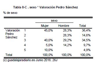 nota la recibe entre los mayores de 65 años: el 50% le ponen un 1. Entre los de 40 a 44 años hay división de opiniones, pues mientras que el 42,9% le suspende con un 1, otro 42,9% le aprueba con un 3. Y todavía queda otro 14,3% que le califica de notable. De hecho, Sánchez aprueba en todas las franjas de edad, con una excepción: los mayores de 65 años entre los que solo el 37,4% le puntúan con una nota de 3 puntos o más. Es la gran falla del candidato socialista, como para Rajoy lo es la población joven.