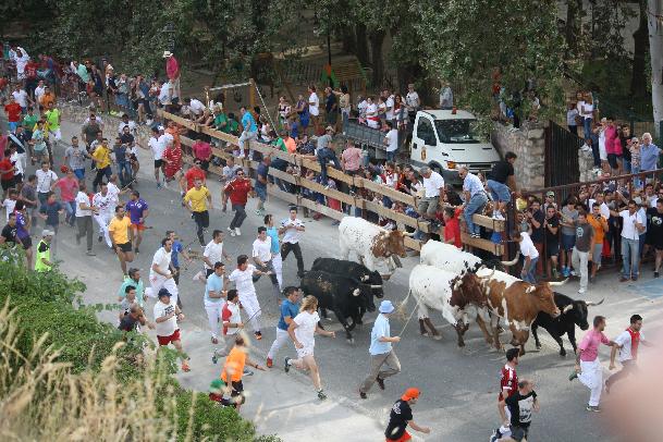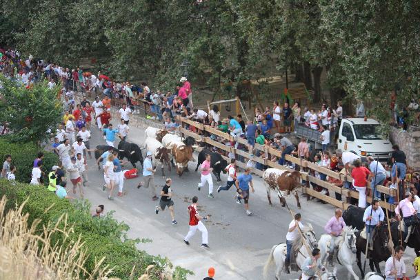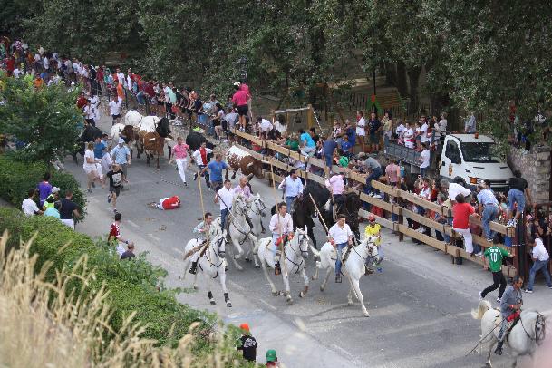 Los toros estuvieron en todo momento muy arropados por los corredores./ Guadalajara Diario. Los otros tres toros hicieron la "fiesta" en los alrededores de Brihuega. A última hora de la tarde, uno de ellos volvió al casco y acabó encerrado en los corrales de San Felipe. Y los otros dos astados hicieron de las suyas, y pasadas las 21,30 horas todavía no se había logrado encerrarlos en San Felipe.