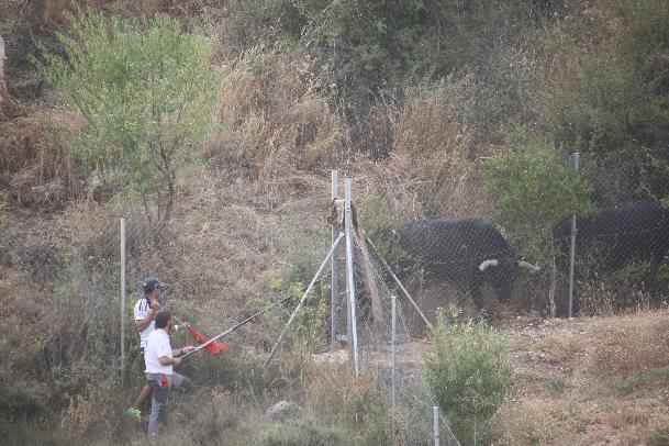 El otro momento que se vivió con más emoción los protagonizaron también estos dos toros. Uno de los astados empitonó al otro junto a una alambrada, y por la fuerza descomunal de los toros la alambrada fue tumbada. Astados y cabestros pasaron a la finca, por lo que los que estaban en ella tuvieron que refugiarse apresuradamente dentro de la casa. Dos corredores acabaron sobre el tejado de la vivienda. Uno de los toros atacó a uno de los coches aparcados, pero al final acabaron saliendo de la finca sin nuevos sobresaltos.